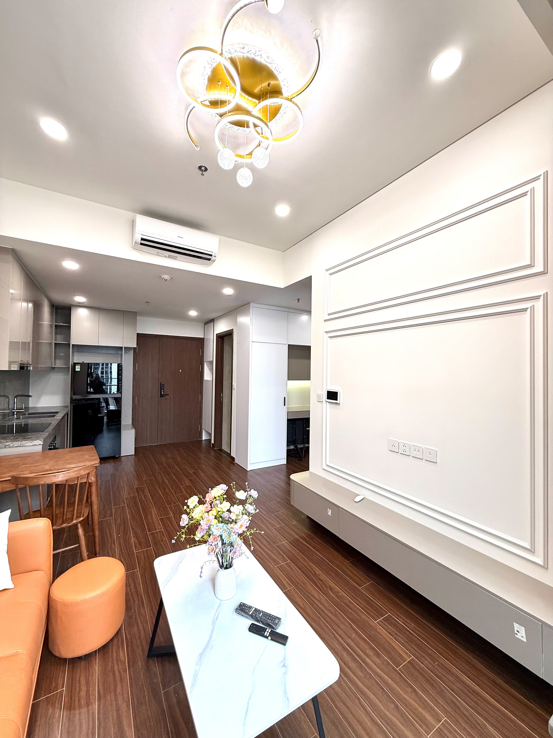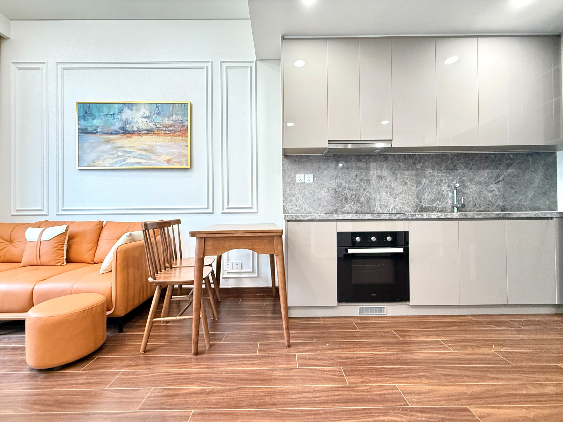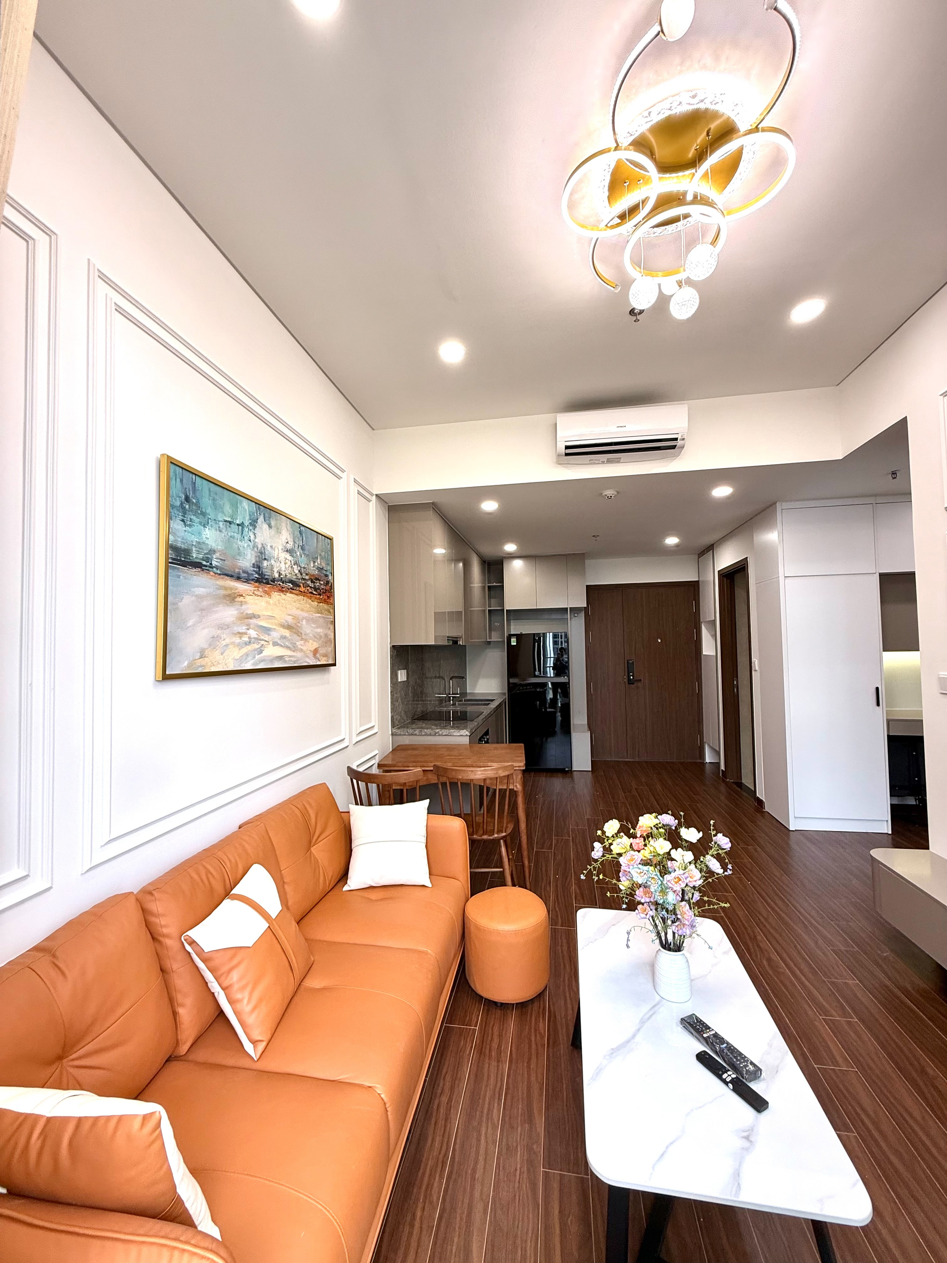 Căn hộ hiện đại, ấm cúng với sàn gỗ, nội thất tông cam đất và trắng. Bếp mở đầy đủ tiện nghi, phòng ngủ có view thành phố thoáng đãng.