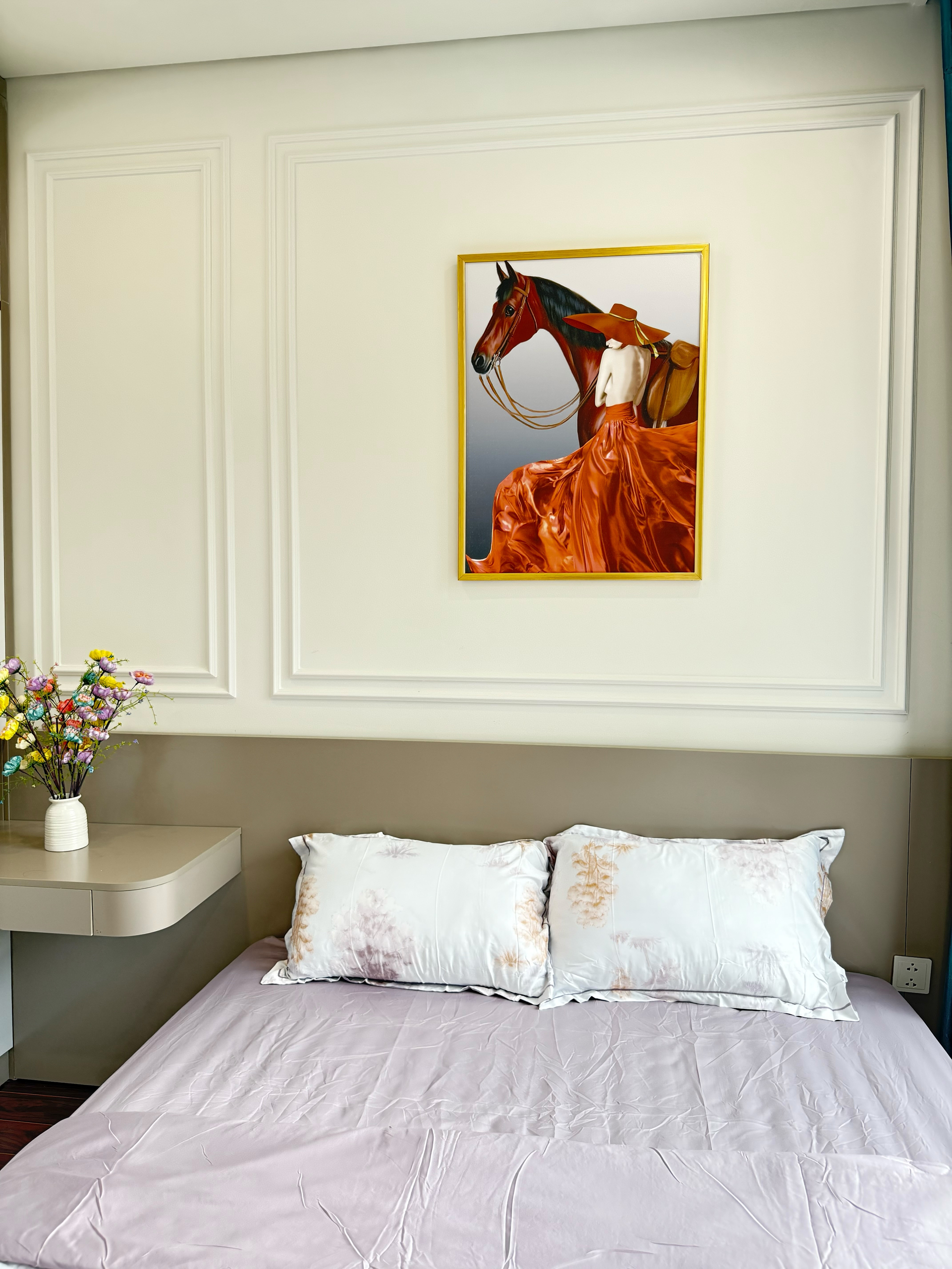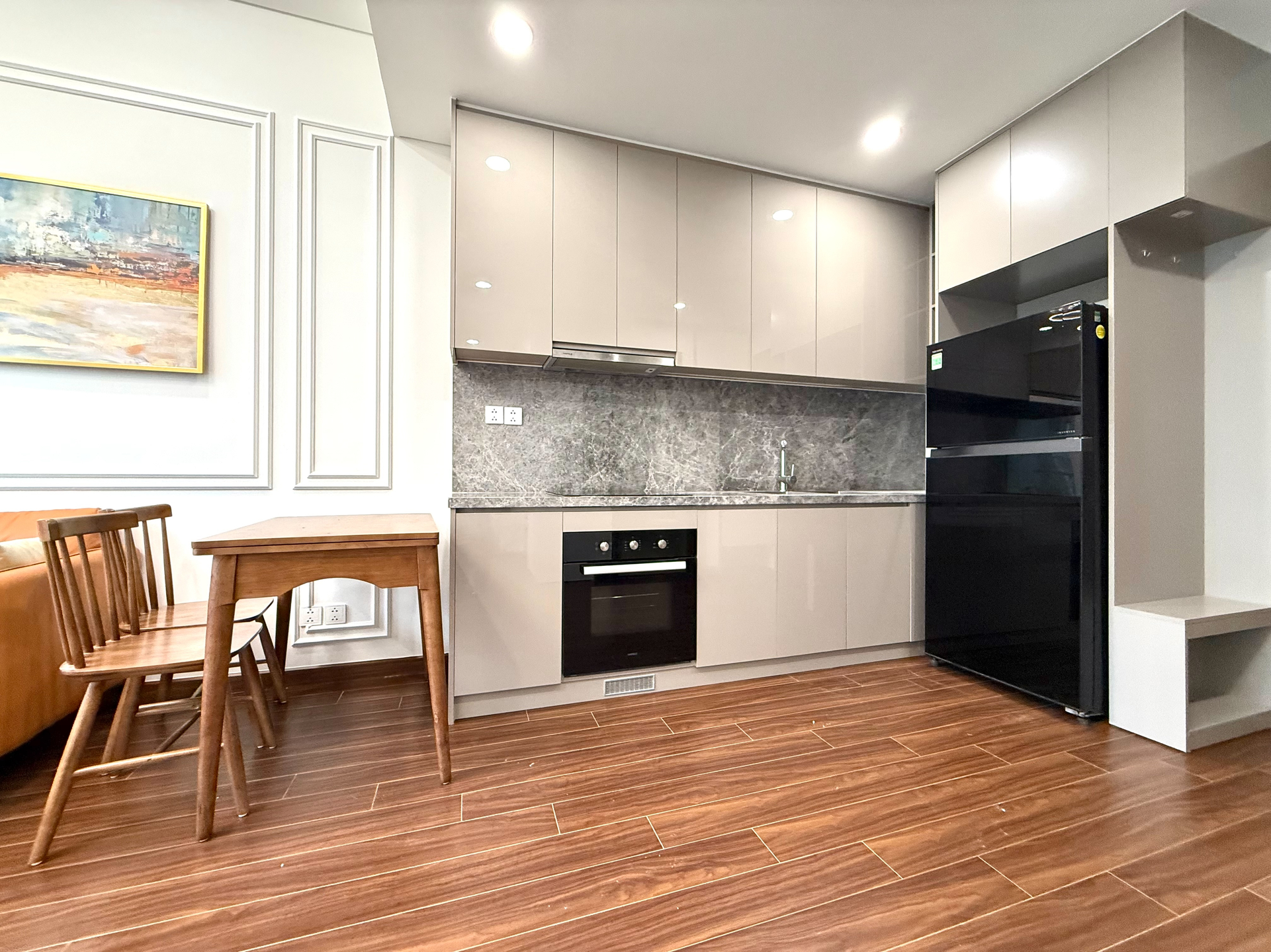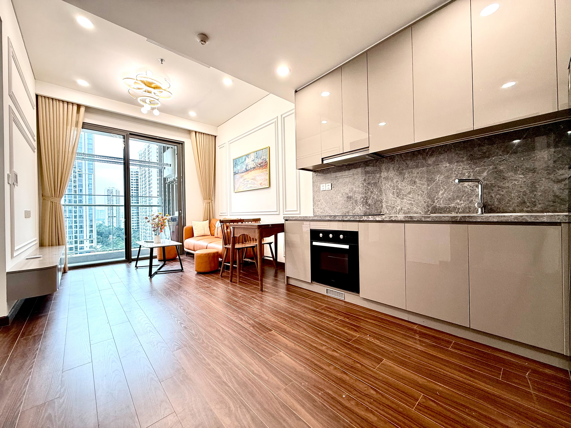 Căn hộ hiện đại, ấm cúng với sàn gỗ, nội thất tông cam đất và trắng. Bếp mở đầy đủ tiện nghi, phòng ngủ có view thành phố thoáng đãng.