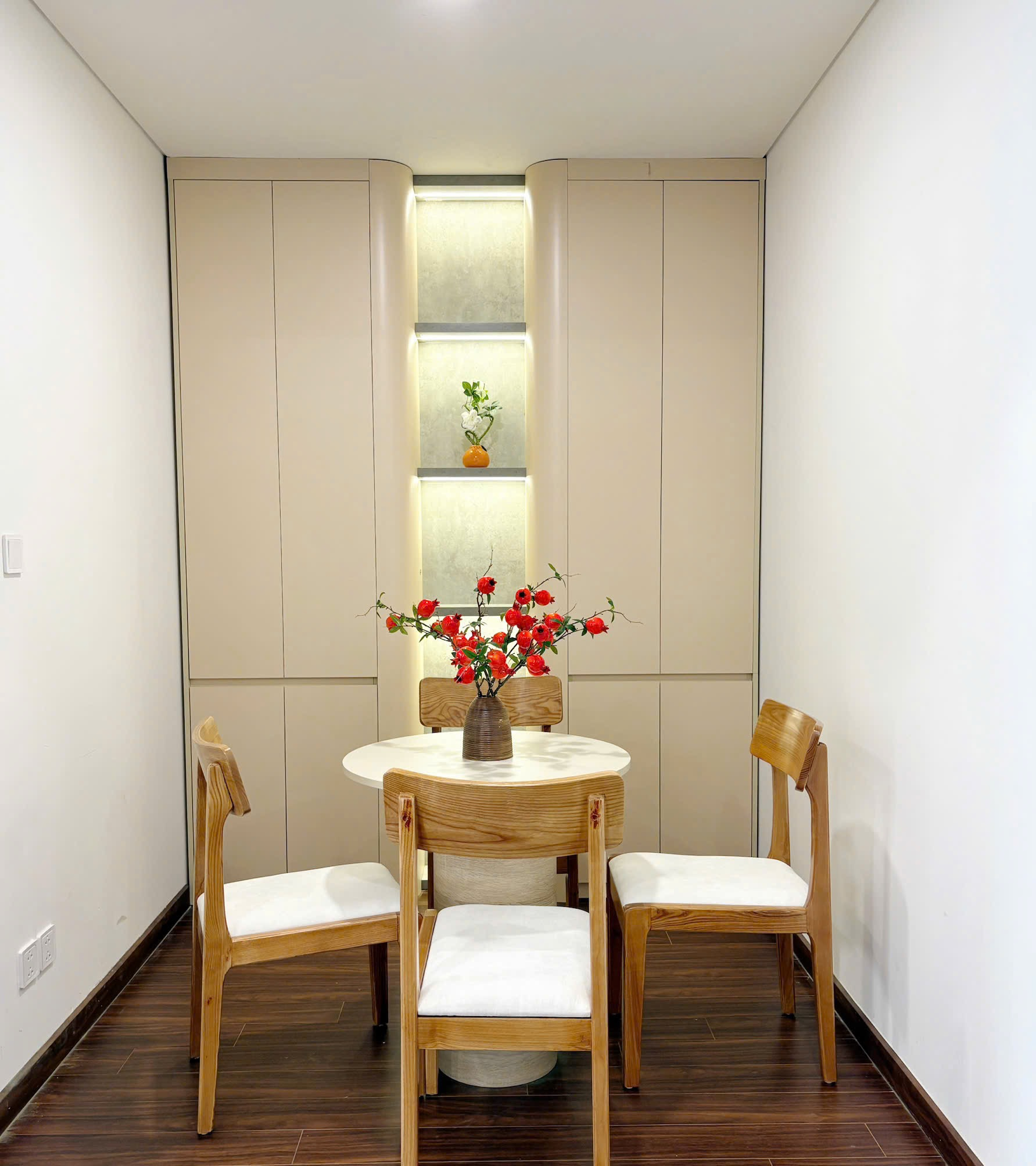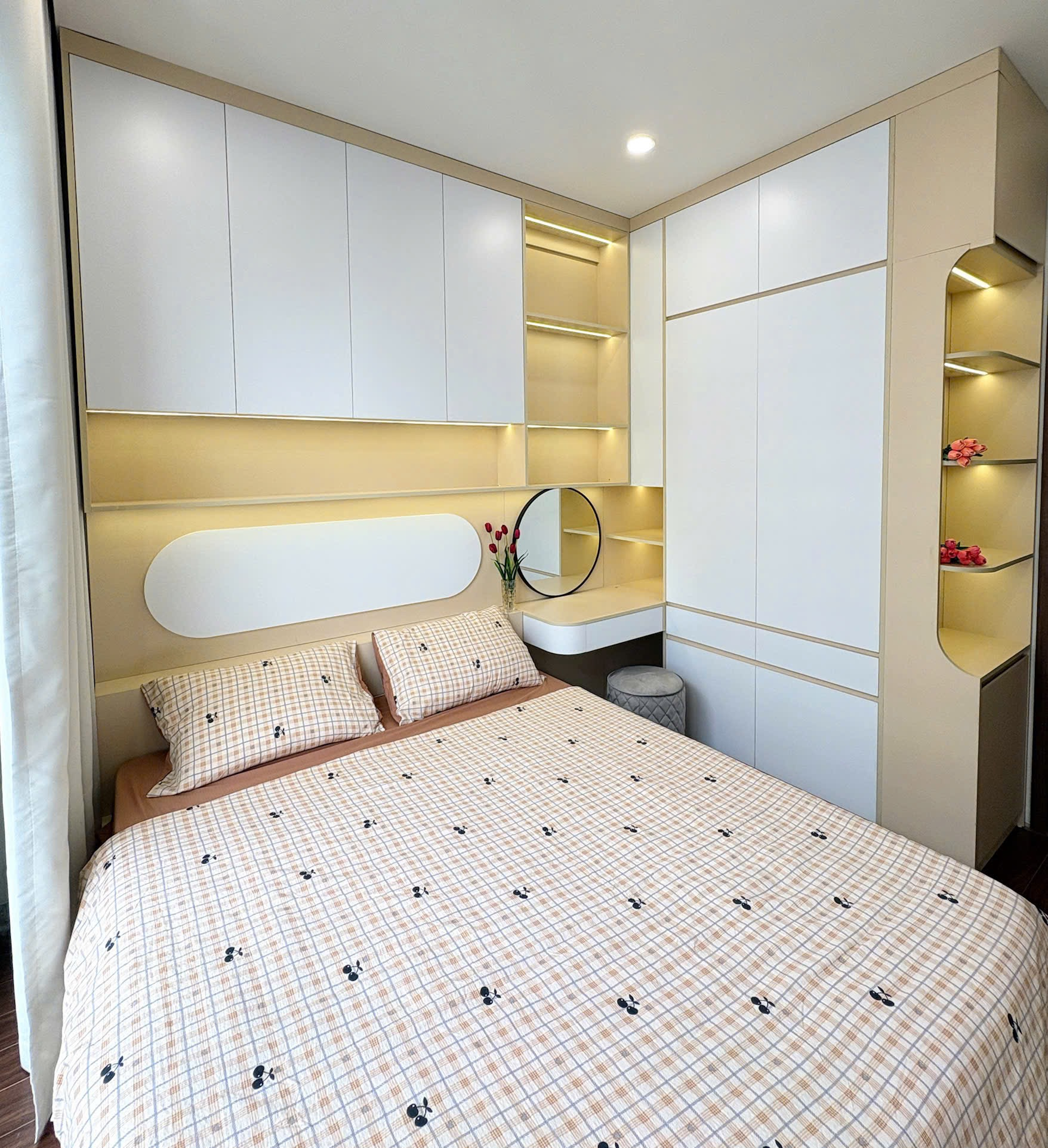 Căn hộ hiện đại, ấm cúng với sàn gỗ, tông màu be chủ đạo. Nội thất đầy đủ, hoàn thiện cao cấp, mang lại không gian sống tiện nghi và sang trọng.