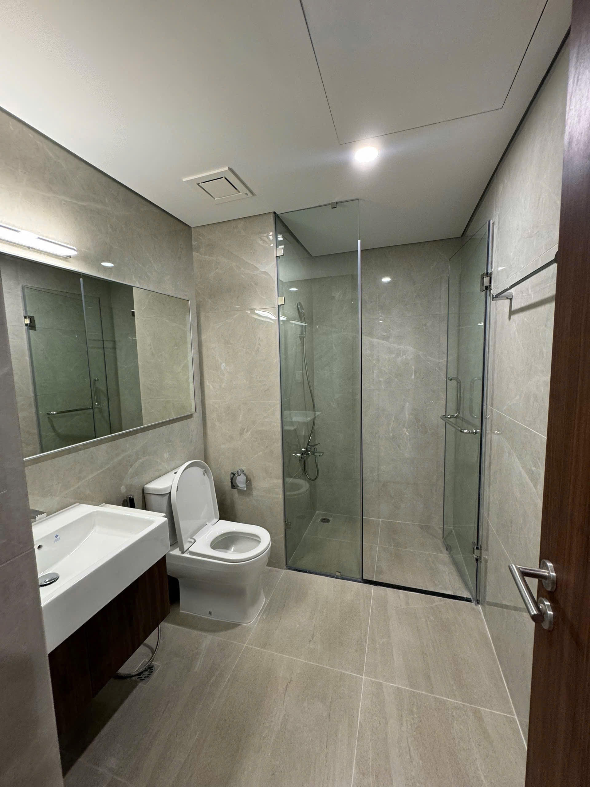 Phòng tắm hiện đại, ốp gạch vân đá sang trọng với vách kính tắm đứng, bồn rửa mặt và toilet cao cấp, đảm bảo vệ sinh và tiện nghi.