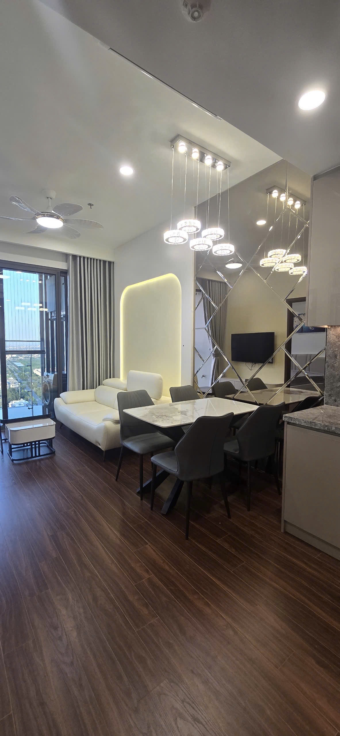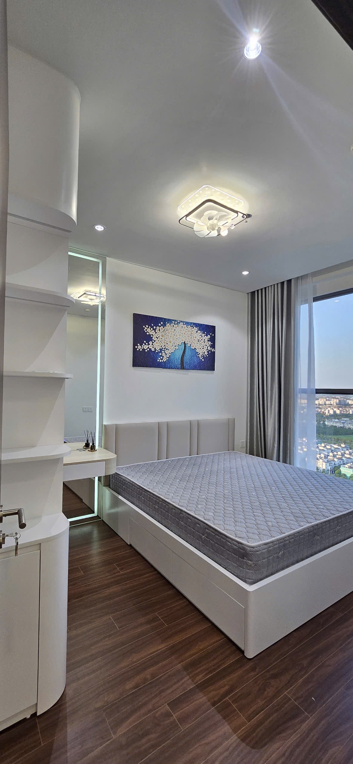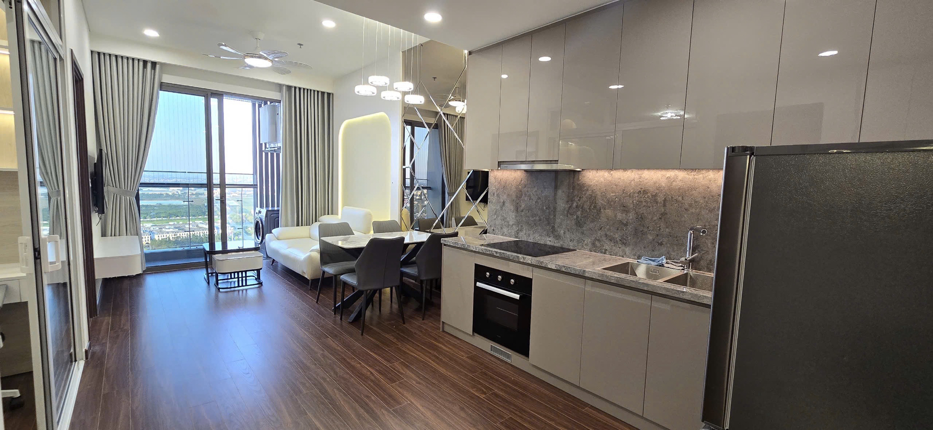 Căn hộ hiện đại, thoáng đãng với sàn gỗ ấm cúng và ánh sáng tự nhiên chan hòa. Nội thất đầy đủ, thiết kế thông minh tối ưu không gian, mang lại trải nghiệm sống tiện nghi và thoải mái.