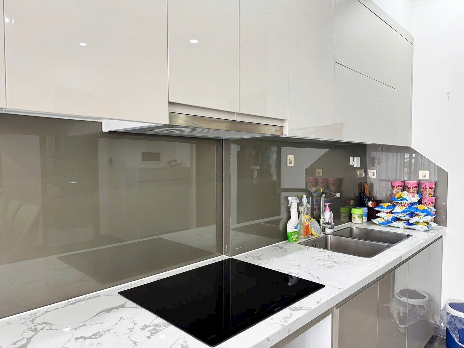 Căn hộ hiện đại, thoáng đãng với tông màu trắng xám chủ đạo, sàn gỗ sang trọng và ánh sáng tự nhiên chan hòa. Đầy đủ tiện nghi, hoàn thiện cao cấp.