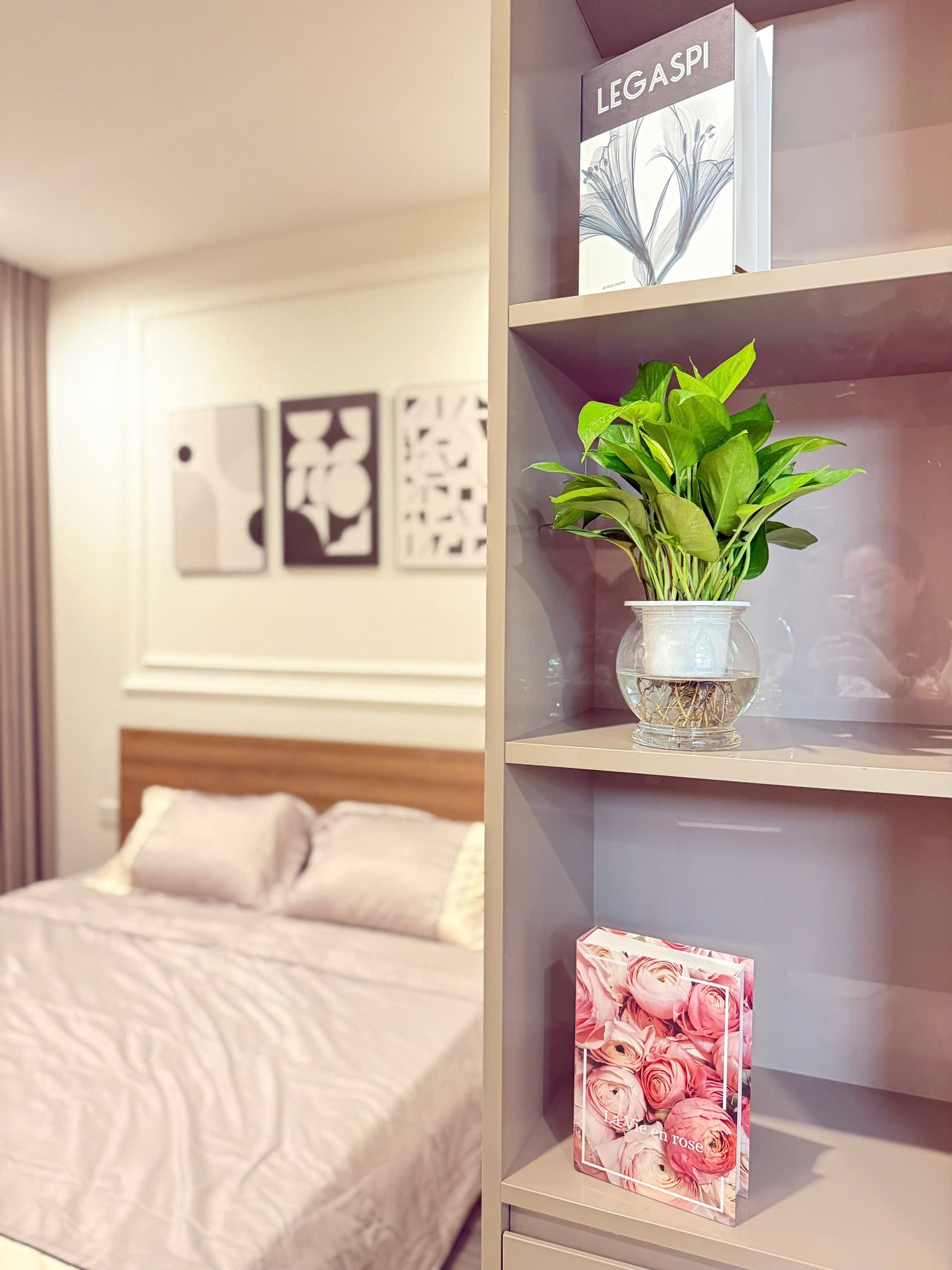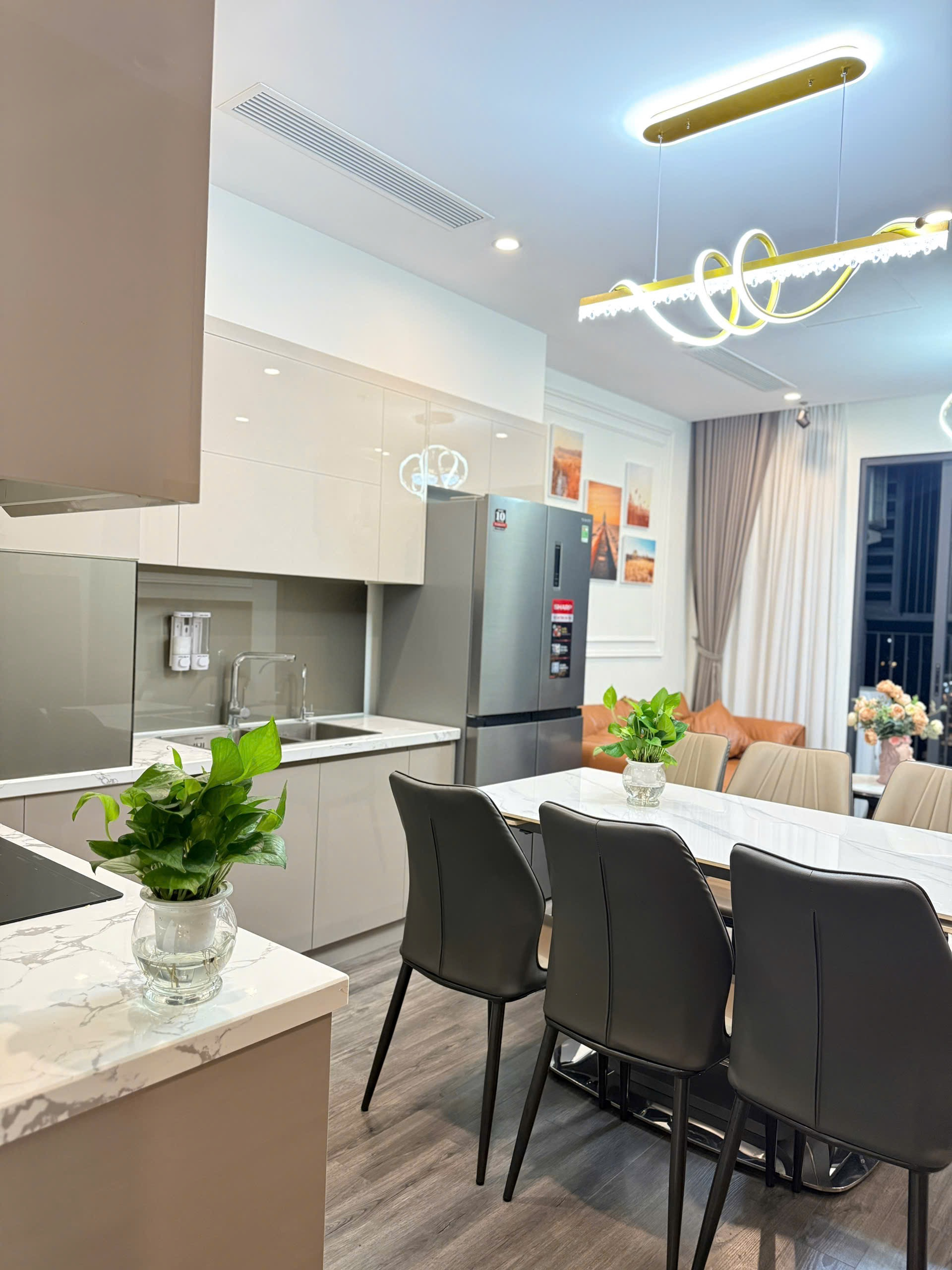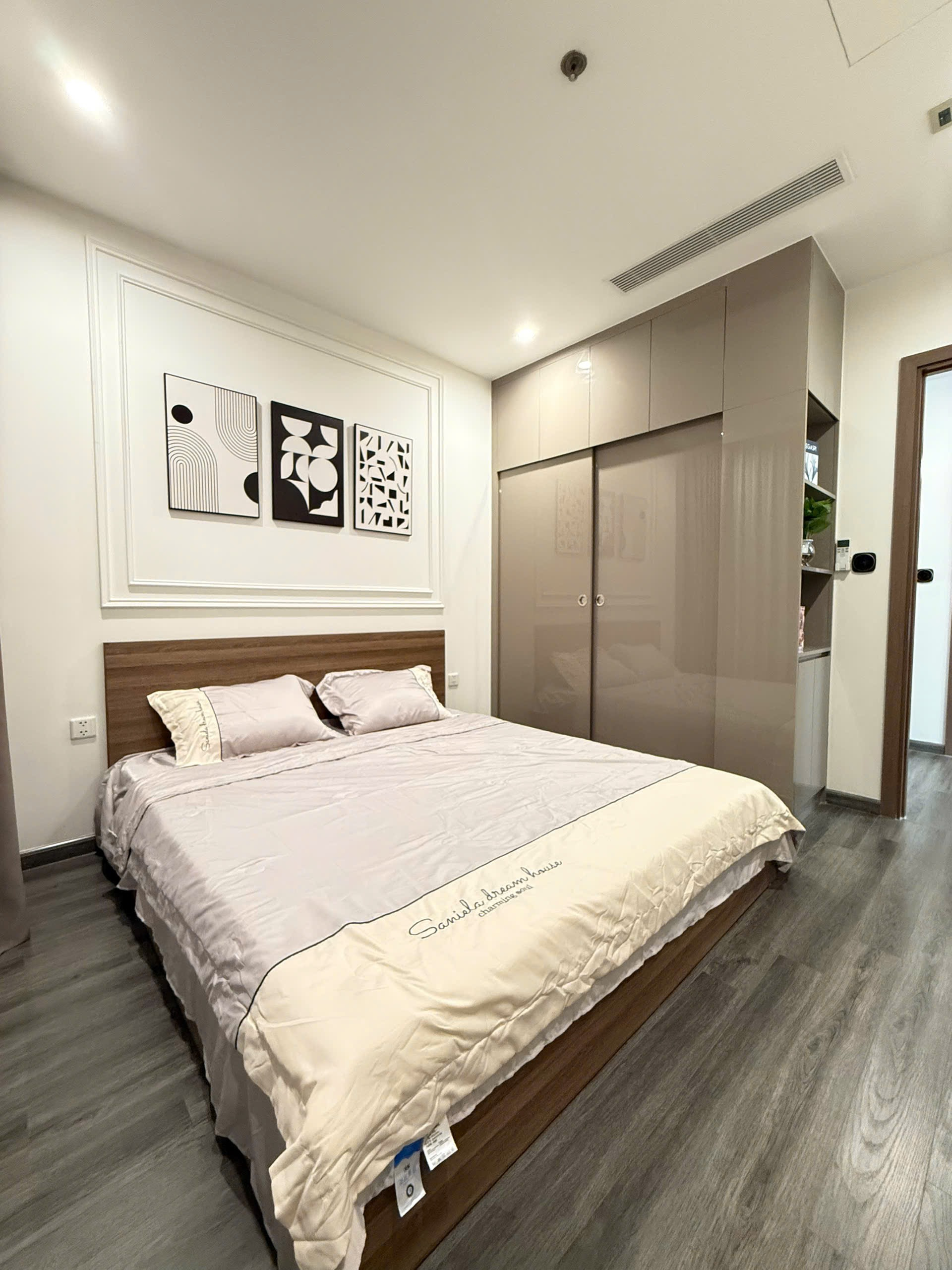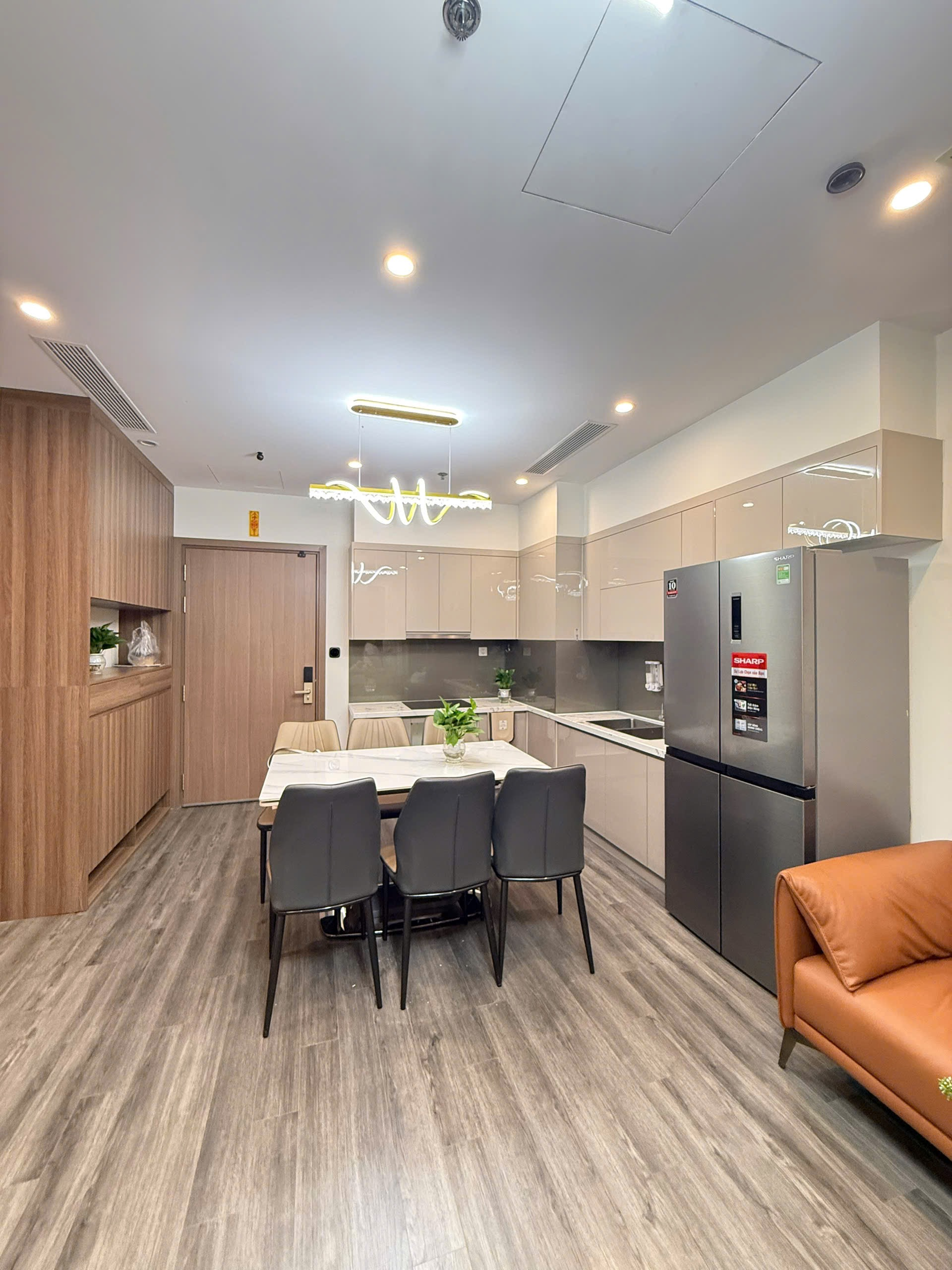 Căn hộ hiện đại, ấm cúng với sàn gỗ, nội thất tông nâu gỗ và trắng be. Không gian mở thoáng đãng, đầy đủ tiện nghi, hoàn thiện cao cấp.