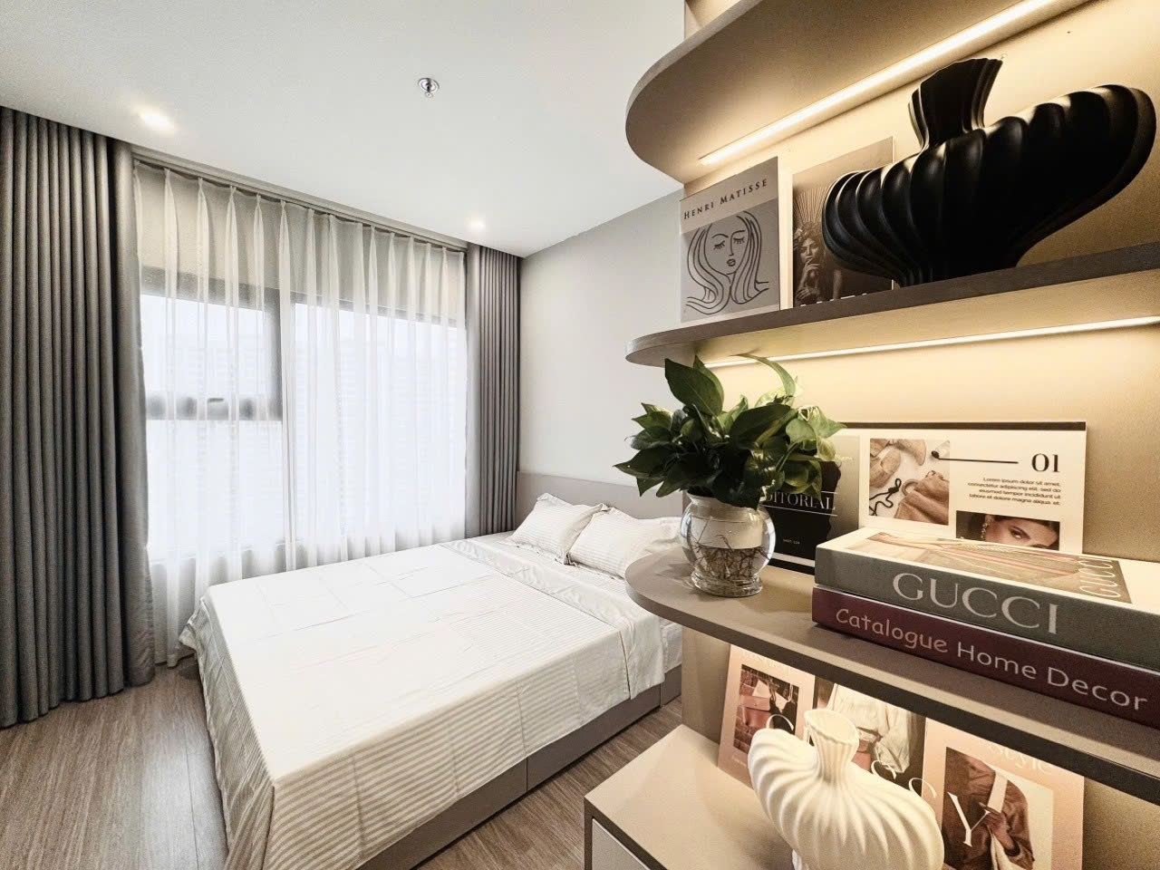 Căn hộ hiện đại, tông màu trung tính sang trọng, nội thất đầy đủ và hoàn thiện cao cấp. Không gian thoáng đãng với ánh sáng tự nhiên chan hòa.