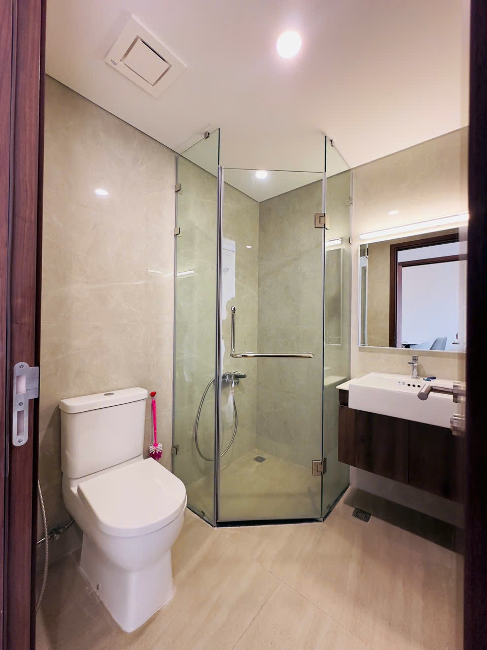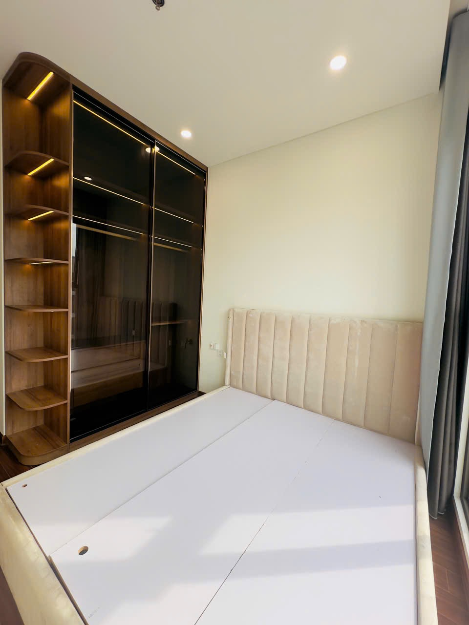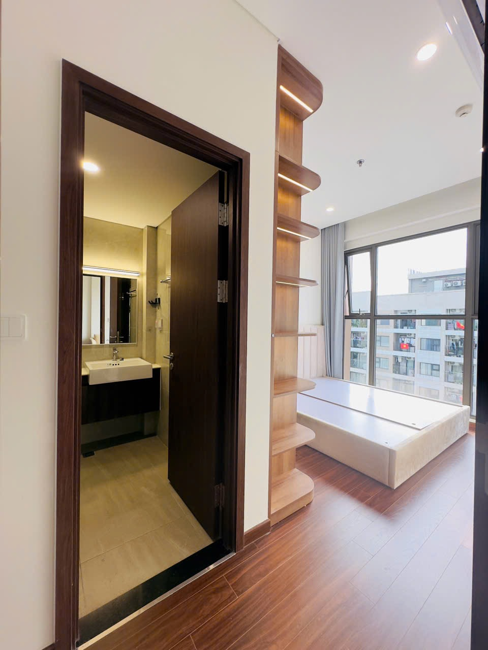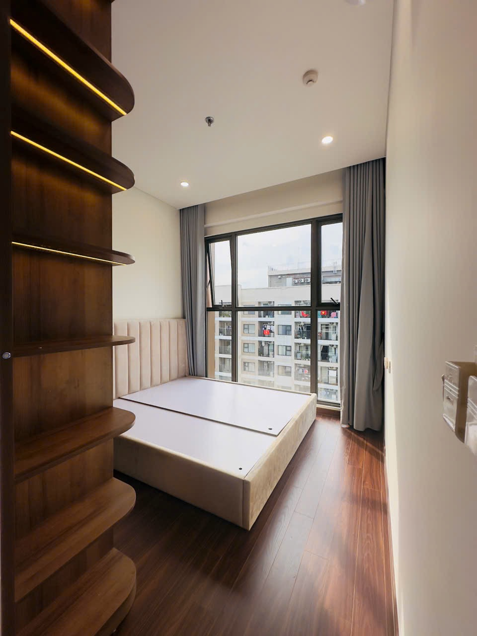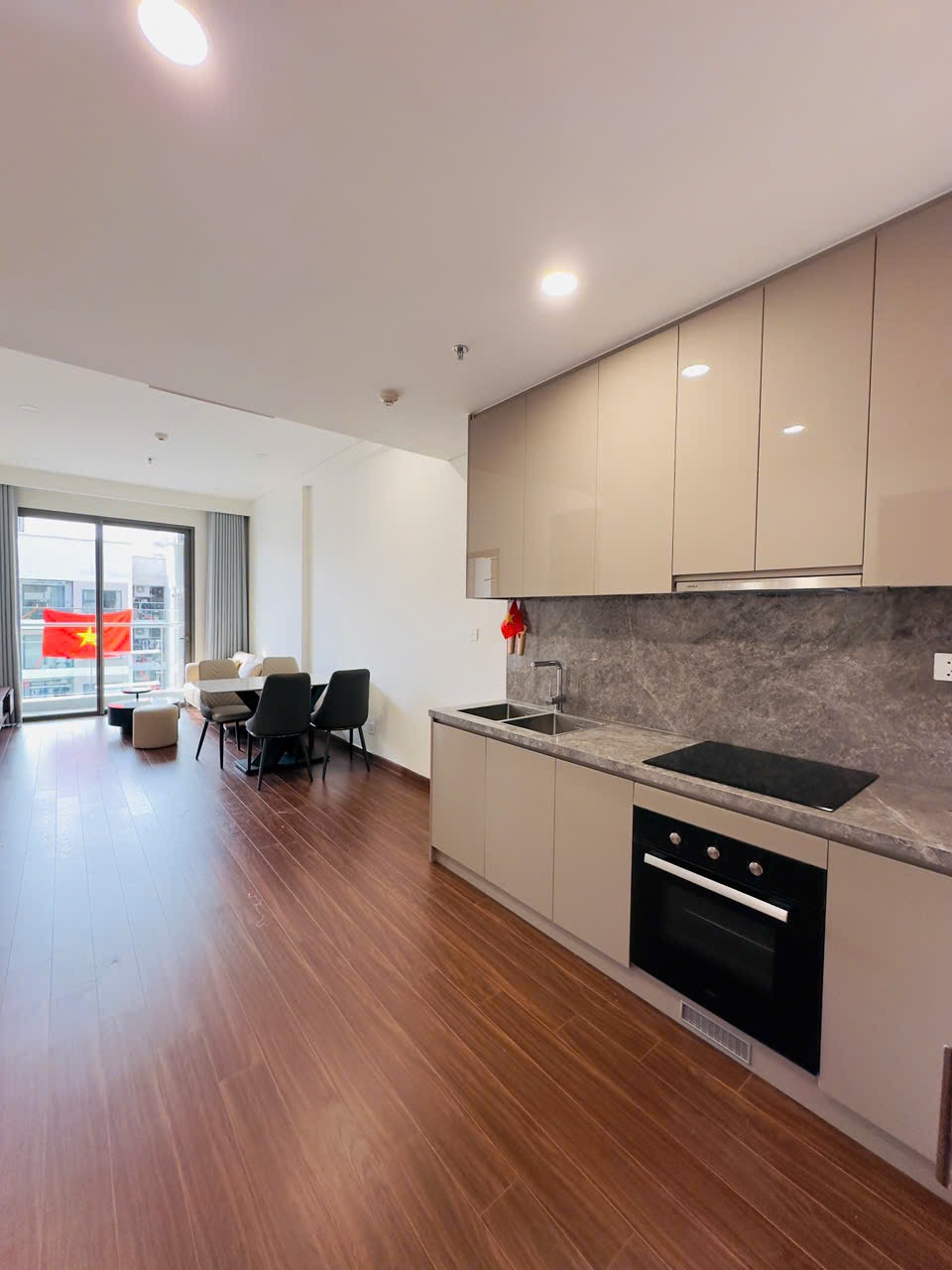Căn hộ hiện đại, thoáng đãng với sàn gỗ ấm cúng và tông màu trung tính. Nội thất cơ bản, hoàn thiện tốt, có ban công và bếp mở tiện nghi.