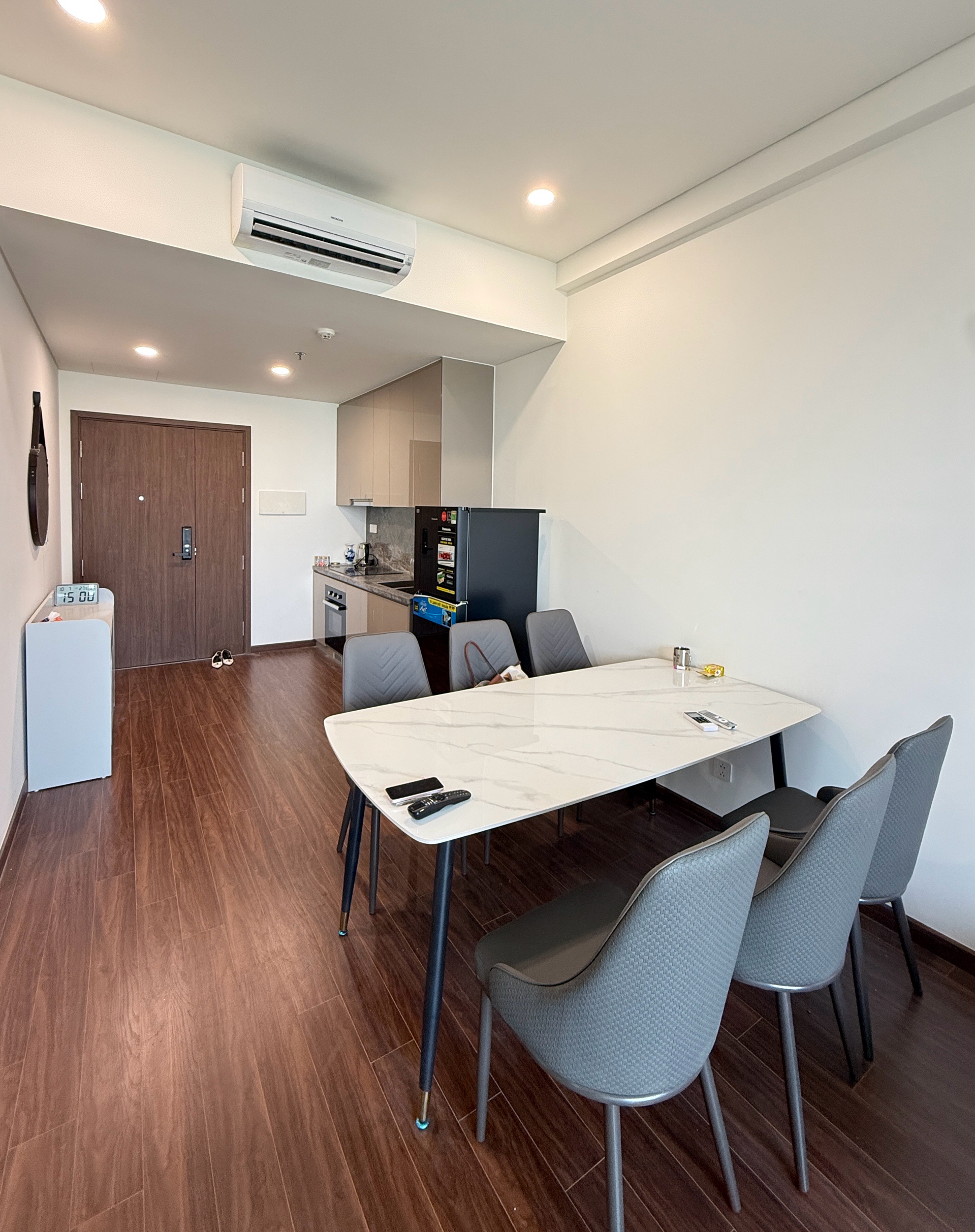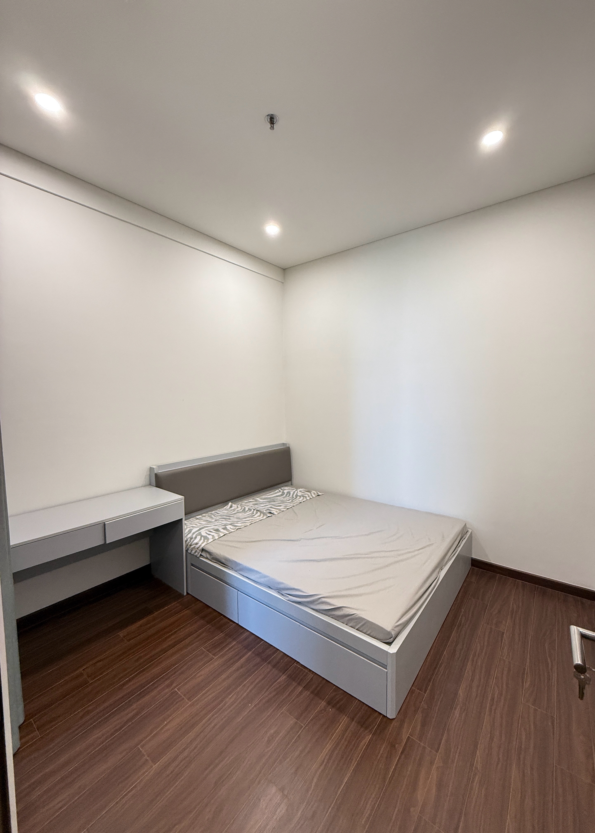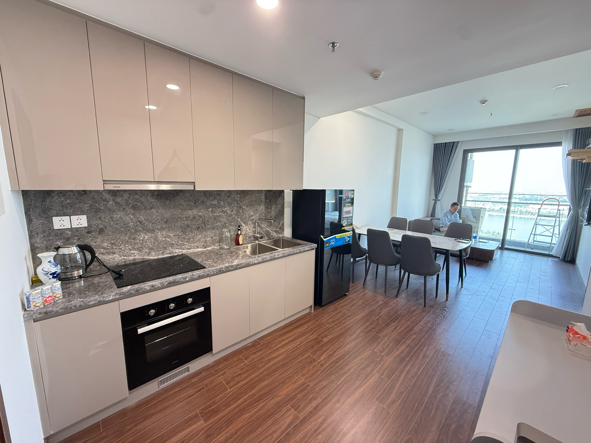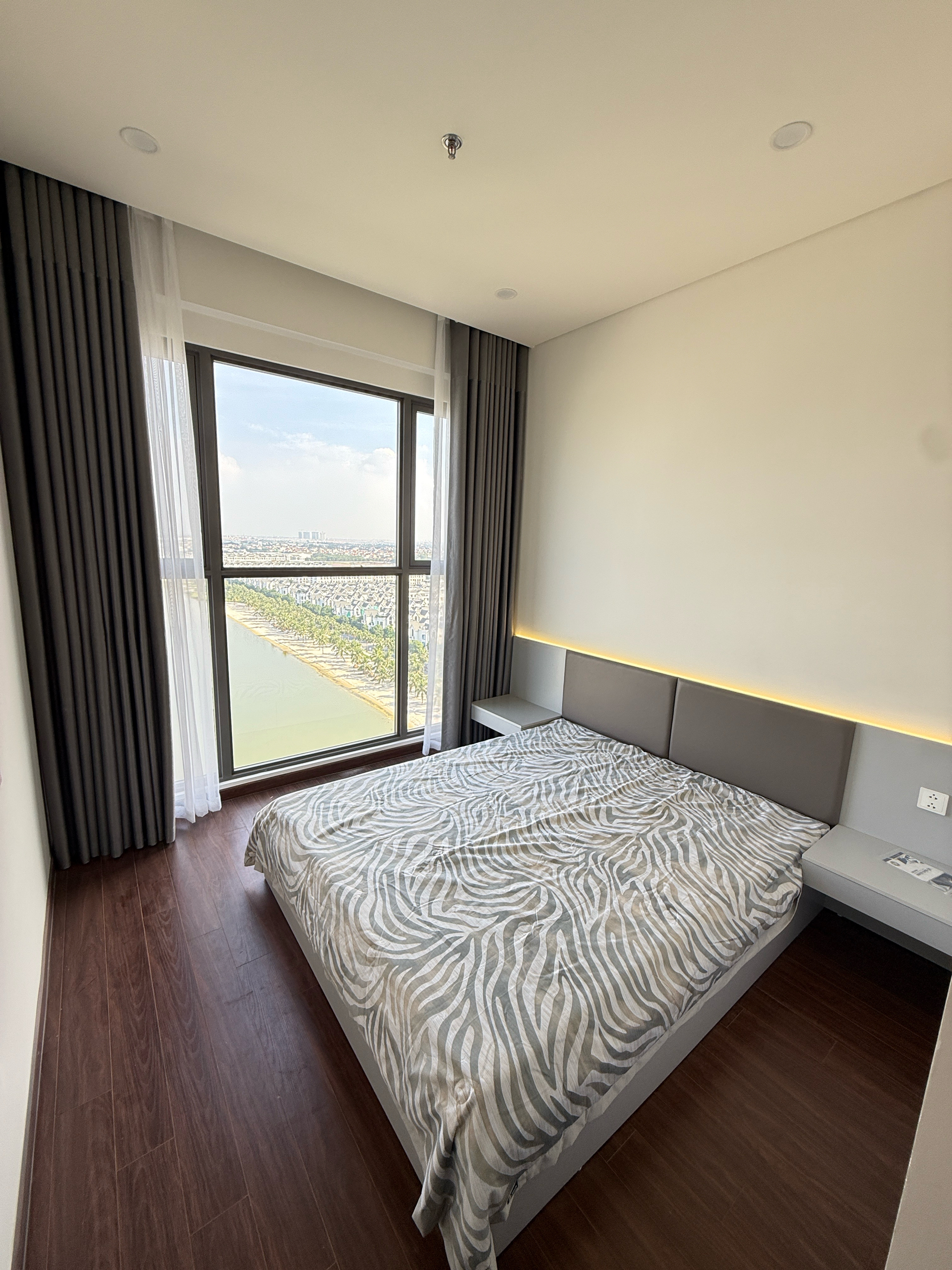 Căn hộ hiện đại, thoáng đãng với sàn gỗ ấm cúng và tông màu trung tính. Nội thất đầy đủ, tiện nghi cao cấp, đặc biệt có ban công và cửa sổ lớn đón ánh sáng tự nhiên cùng view sông tuyệt đẹp.