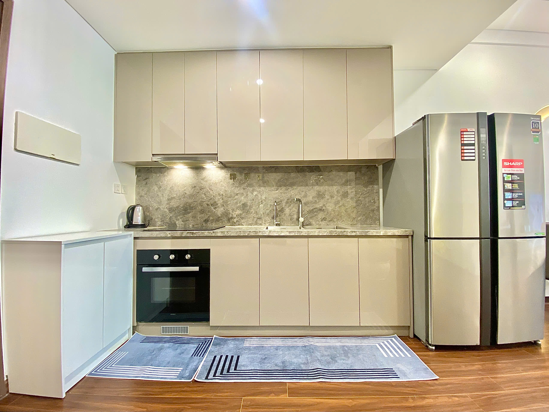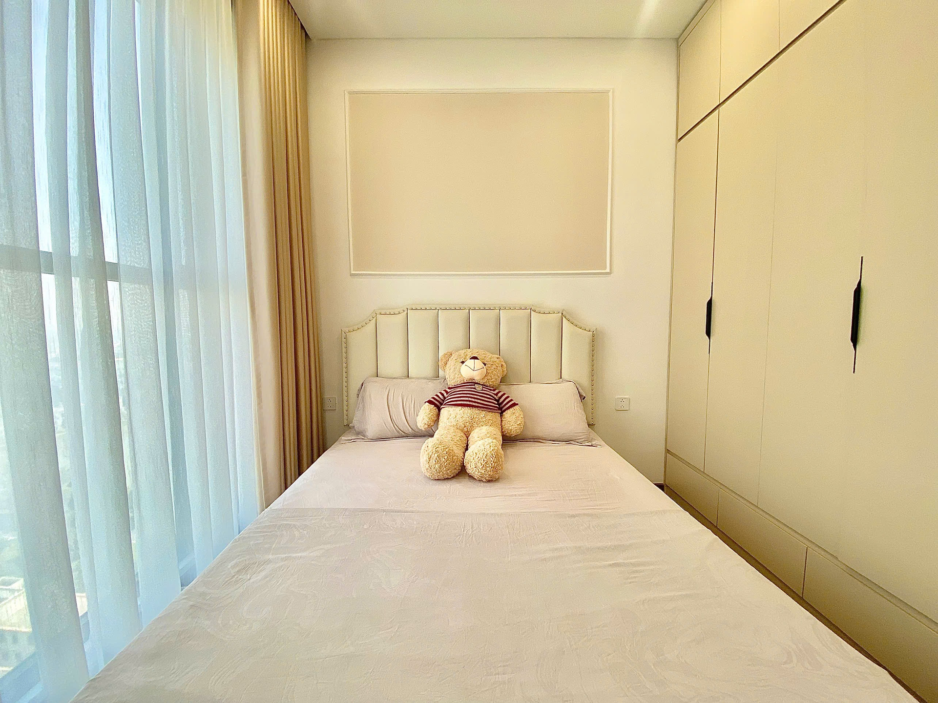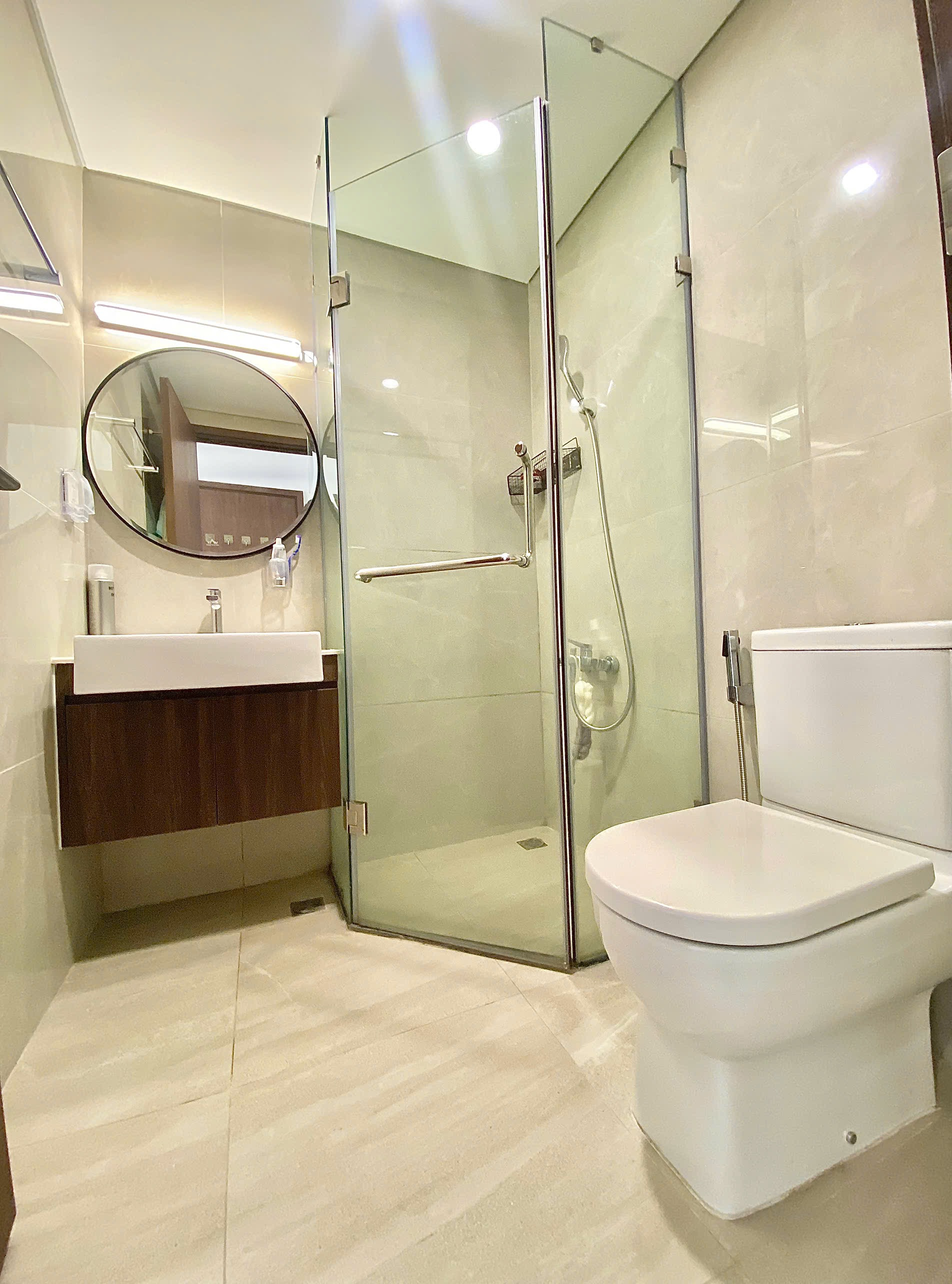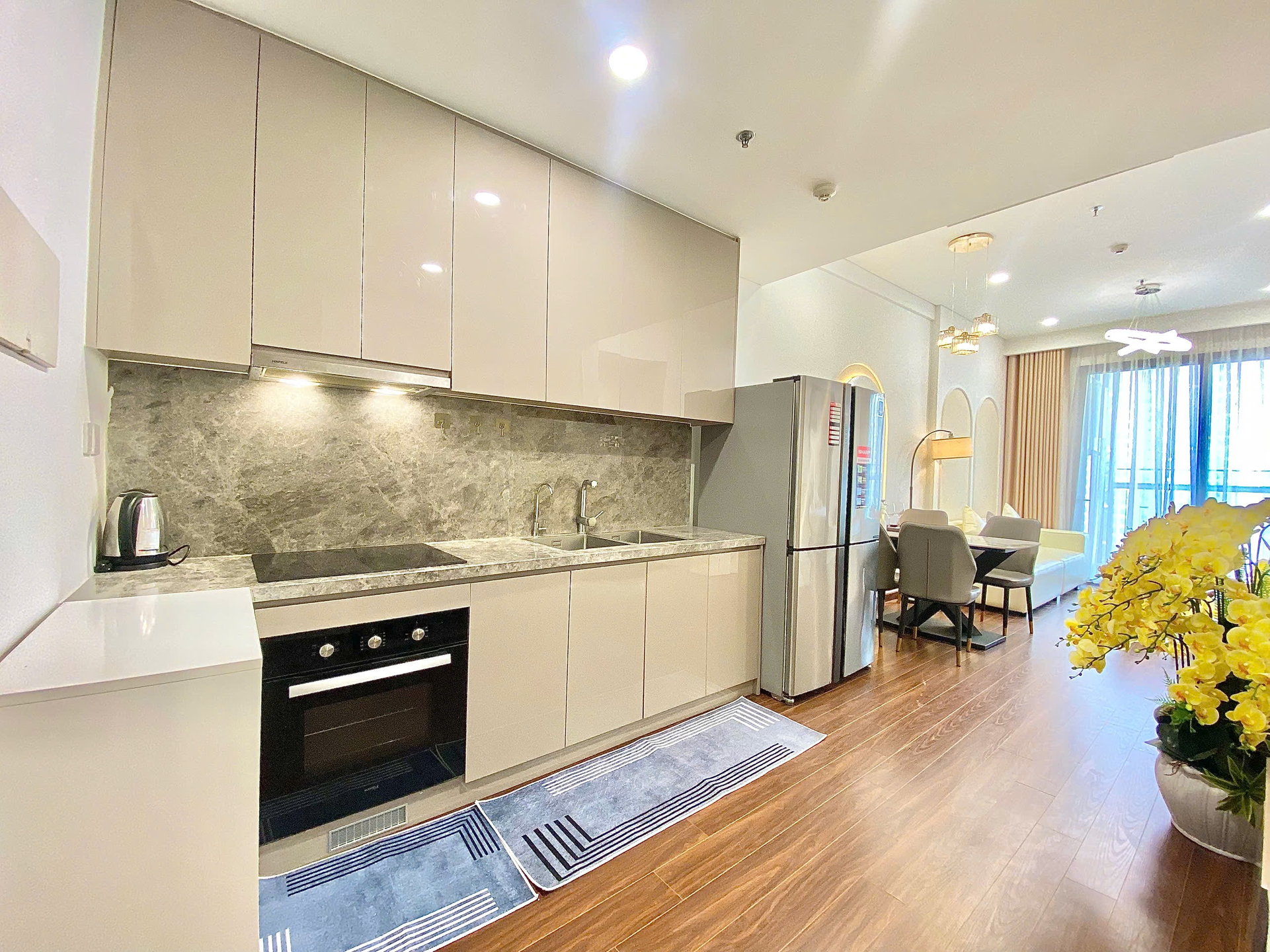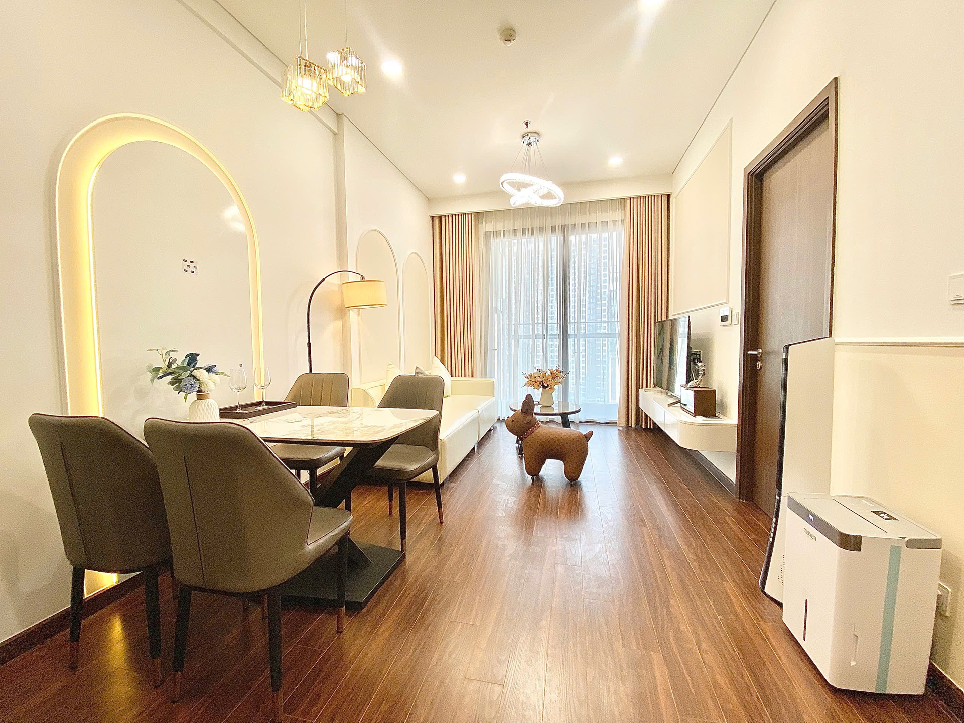 Căn hộ hiện đại, tông màu be ấm cúng với sàn gỗ tự nhiên, ánh sáng chan hòa. Nội thất đầy đủ, hoàn thiện cao cấp, mang lại không gian sống tiện nghi và sang trọng.