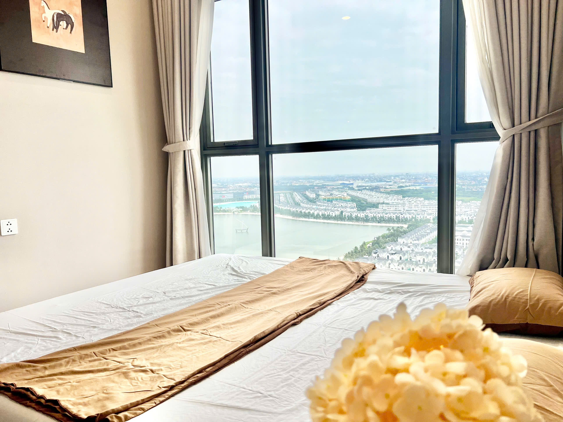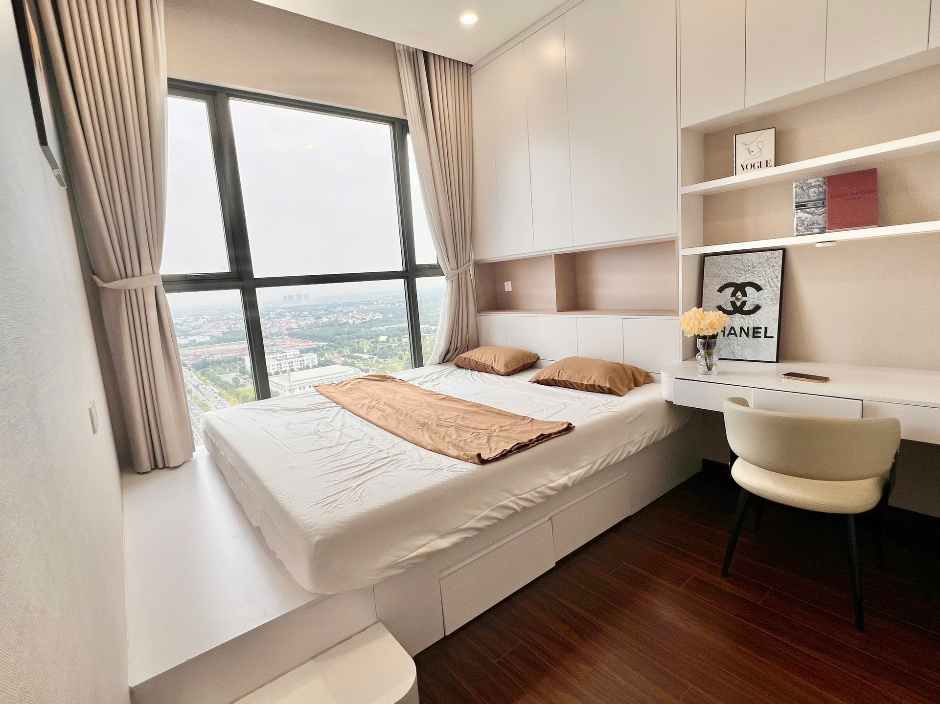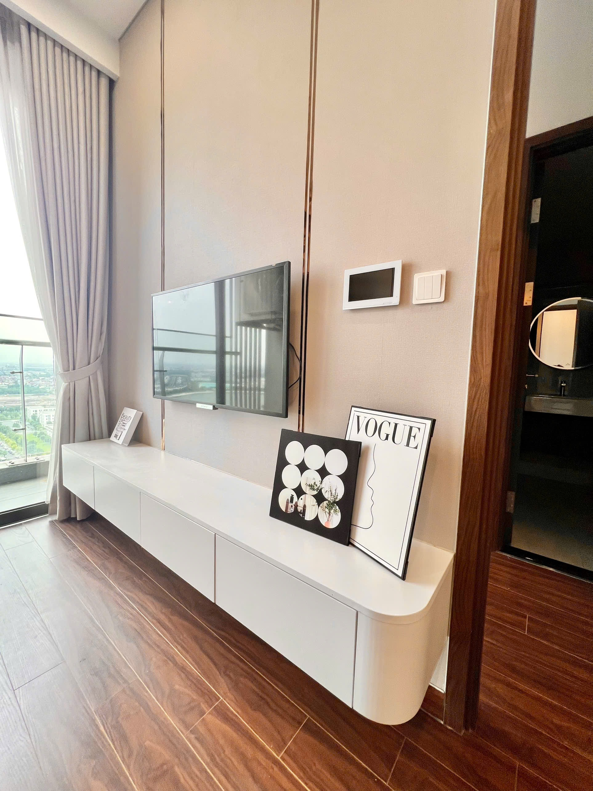 Căn hộ hiện đại, sang trọng với tông màu be ấm cúng, sàn gỗ cao cấp và nội thất đầy đủ. Tận hưởng ánh sáng tự nhiên và tầm nhìn tuyệt đẹp từ cửa sổ lớn.