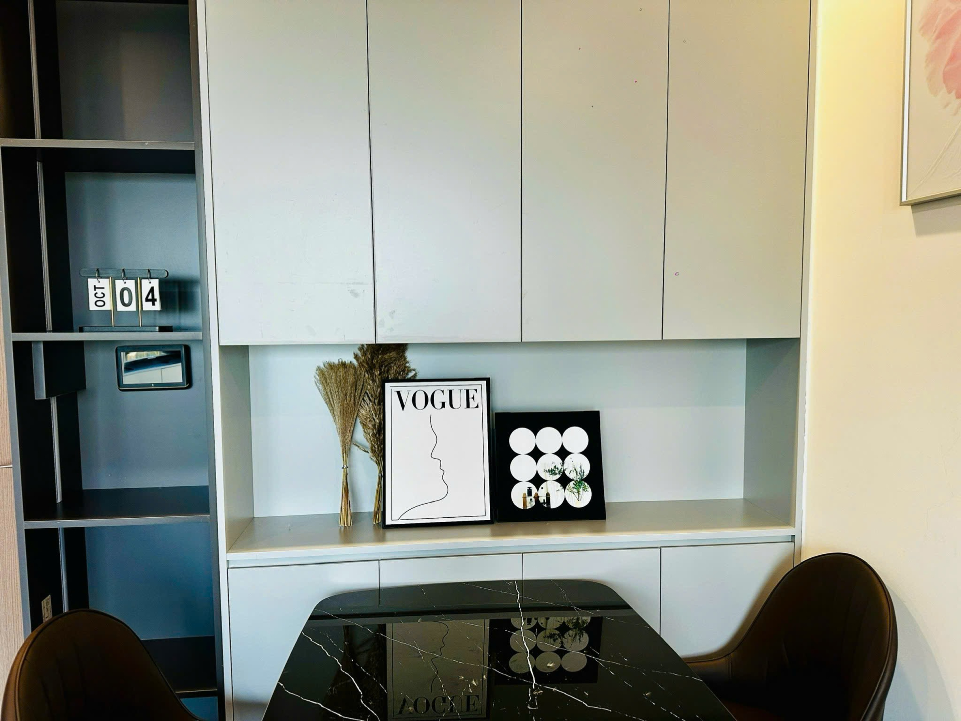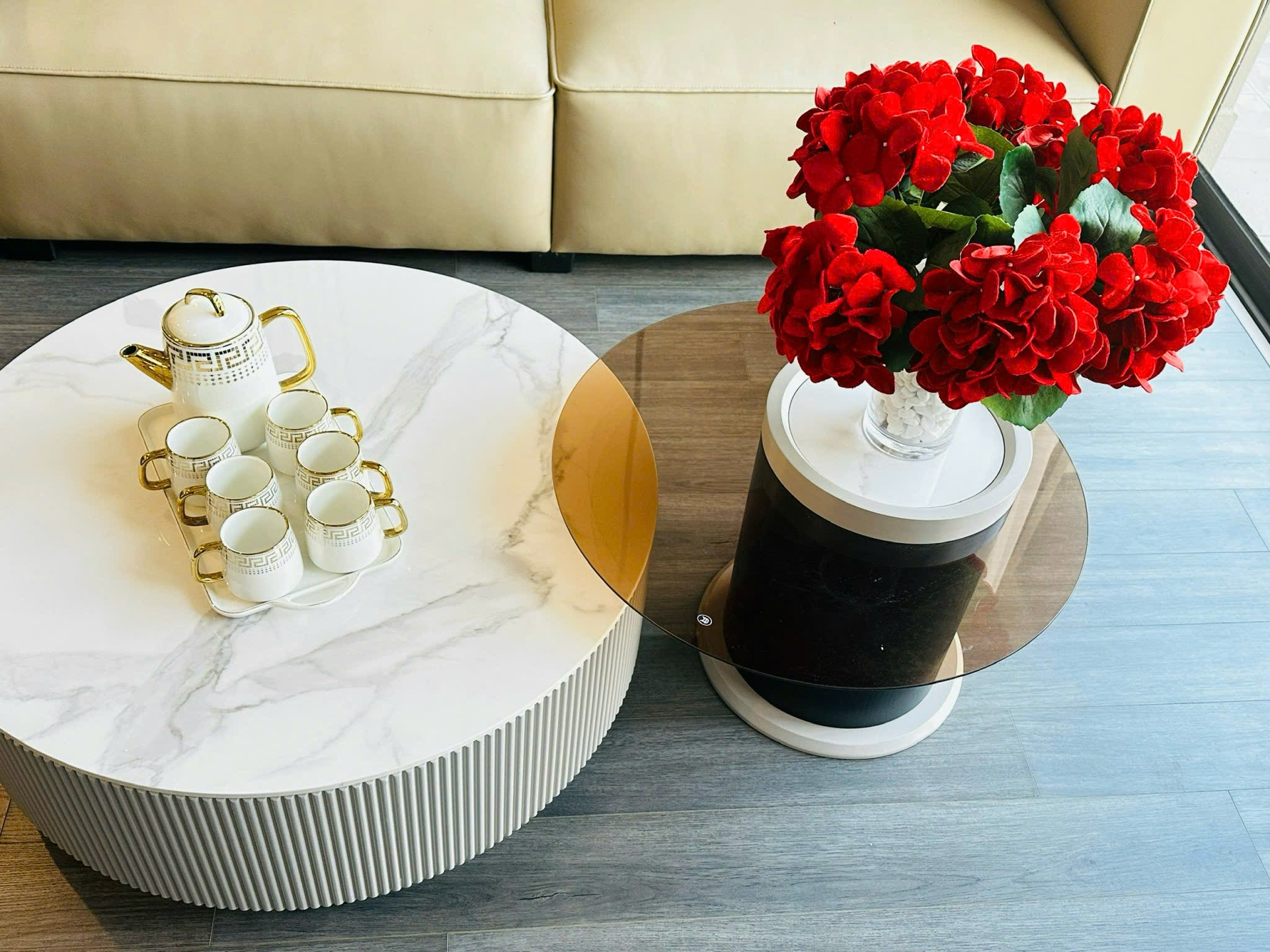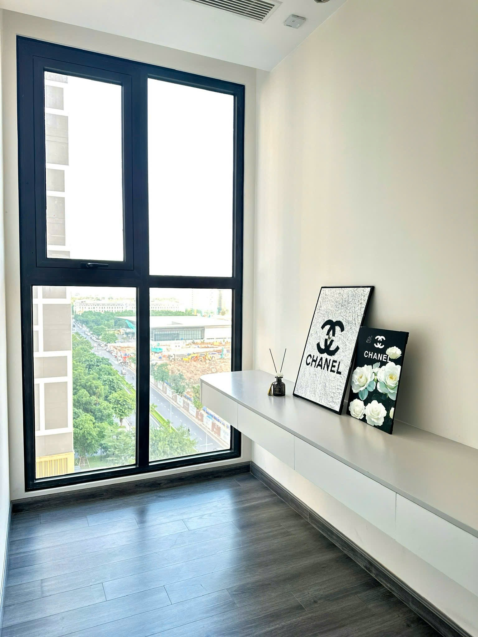 Căn hộ hiện đại, sang trọng với tông màu trắng xám chủ đạo, nội thất cao cấp và ánh sáng tự nhiên chan hòa từ cửa sổ lớn.