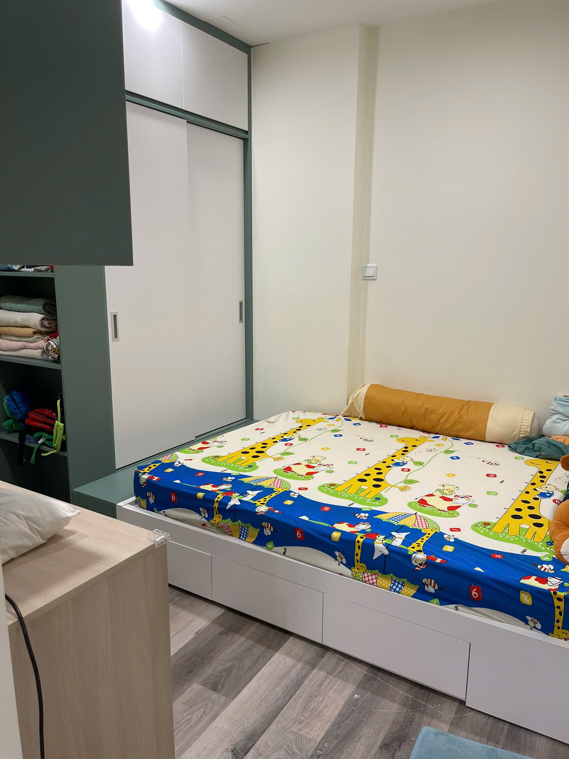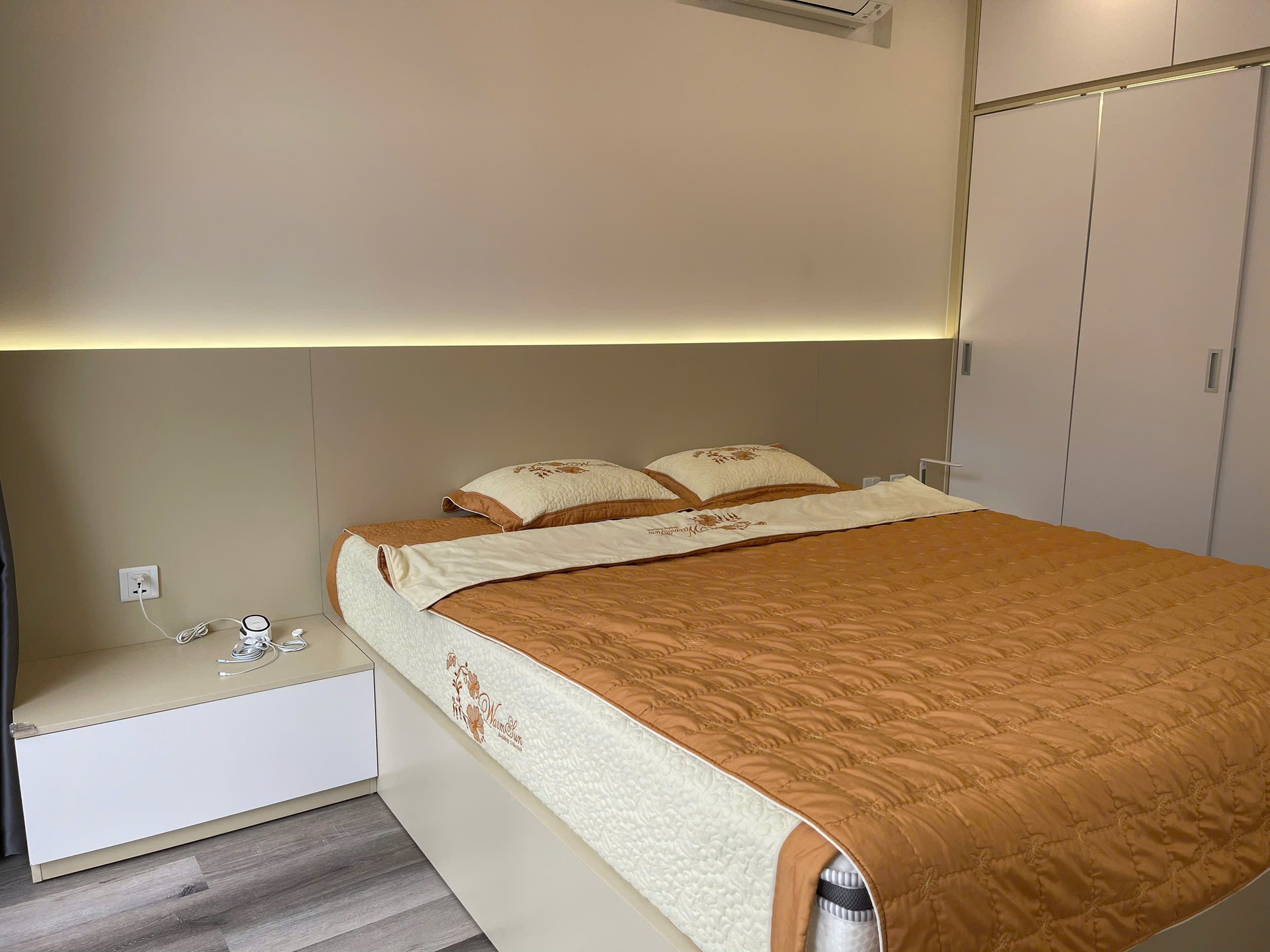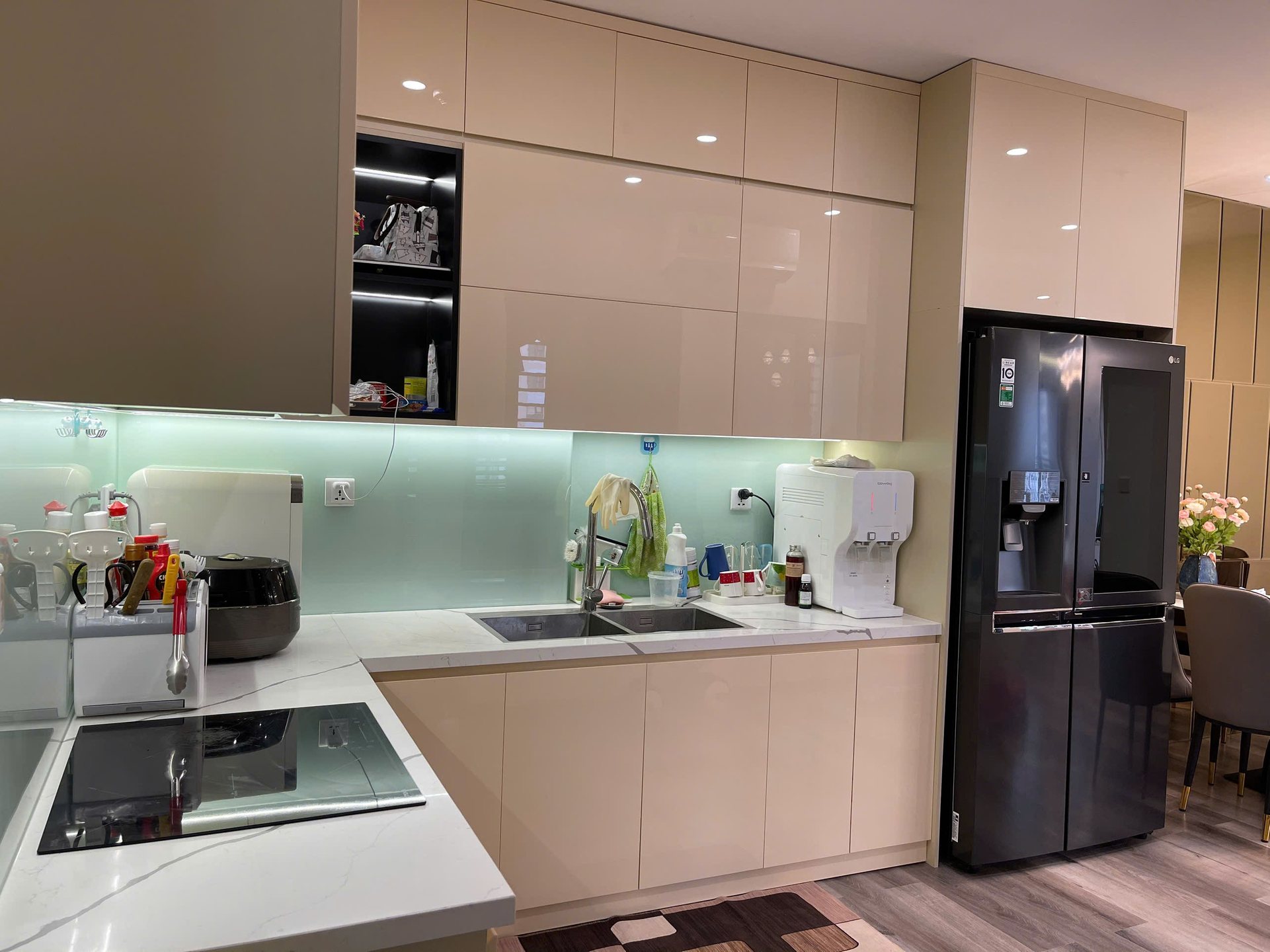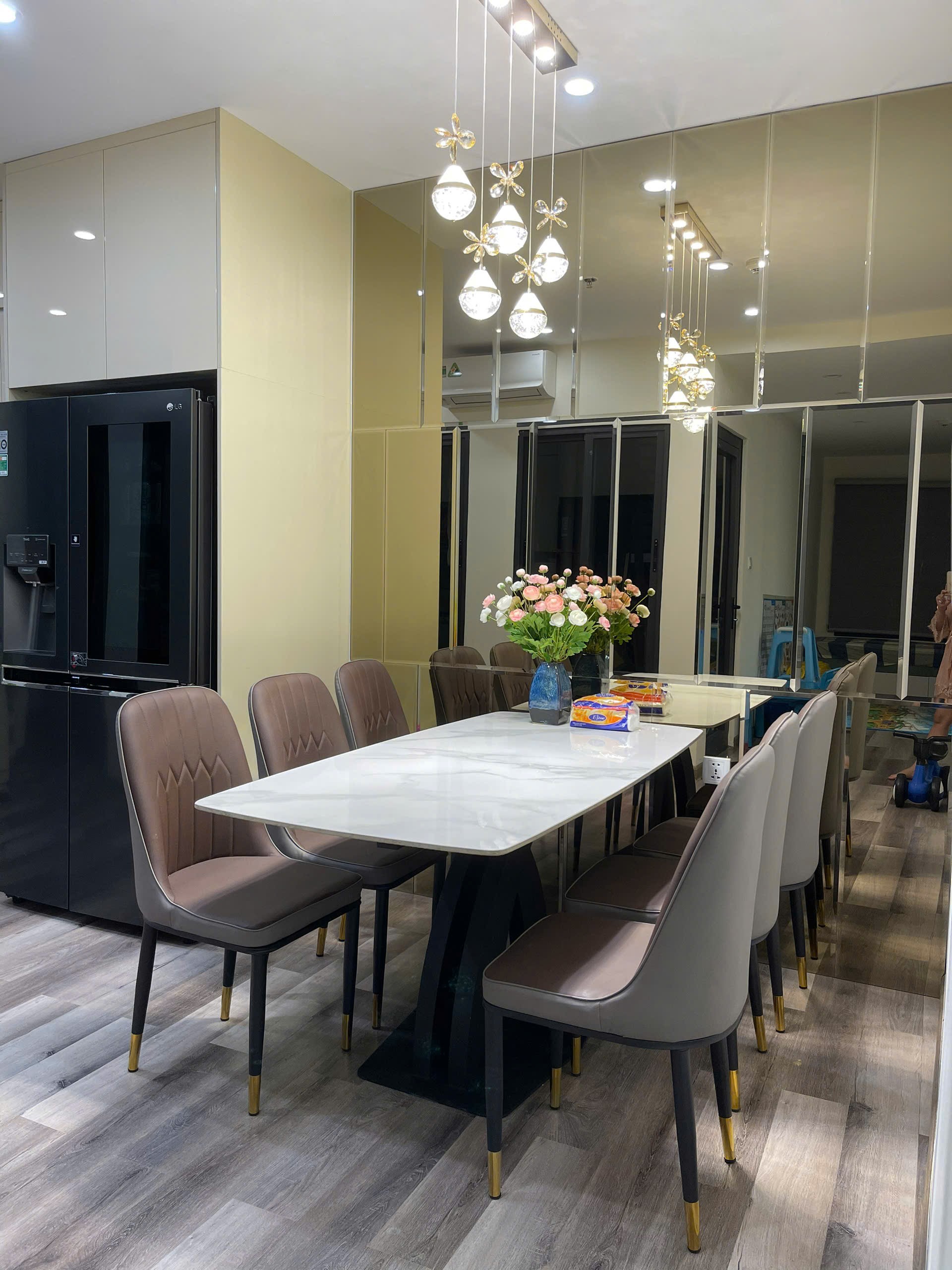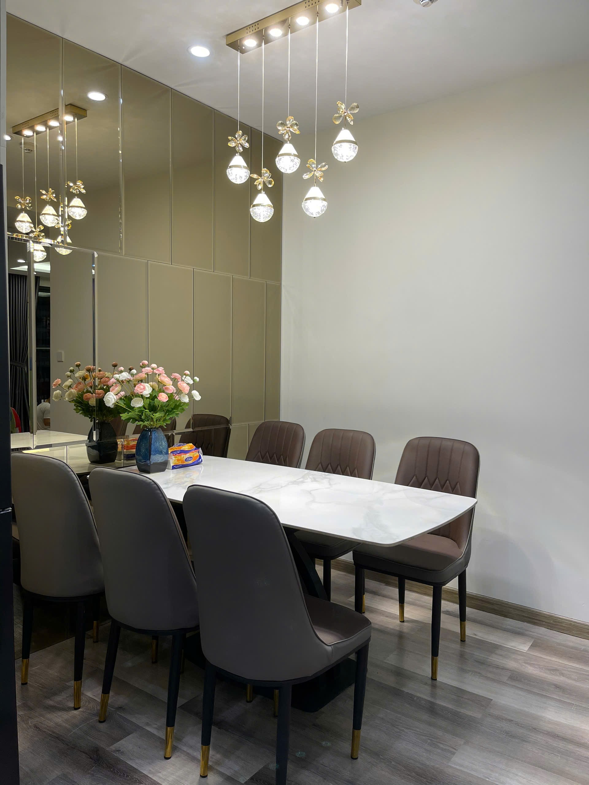 Căn hộ hiện đại, sang trọng với nội thất cao cấp, tông màu be và xám chủ đạo. Không gian sống tiện nghi, ấm cúng, phù hợp cho gia đình.