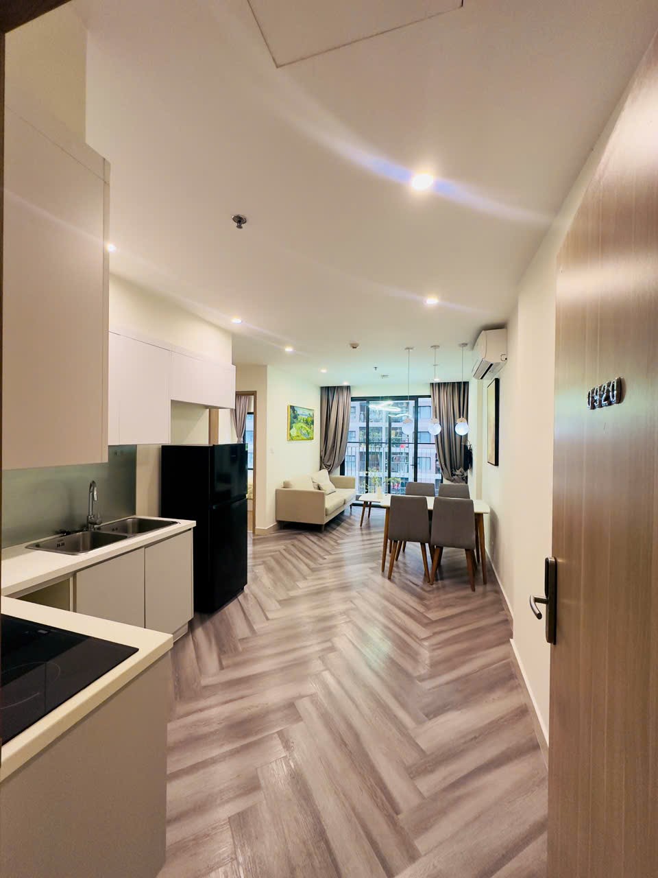 Căn hộ hiện đại, thoáng đãng với sàn gỗ xương cá, tông màu trung tính ấm cúng. Nội thất đầy đủ, hoàn thiện cao cấp, mang lại không gian sống tiện nghi.