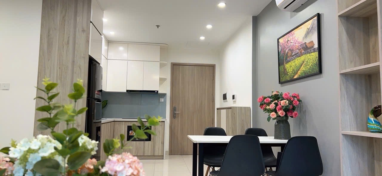 Căn hộ hiện đại, tông màu trung tính ấm cúng với sàn gỗ và gạch men. Không gian thoáng đãng, đầy đủ tiện nghi cơ bản, hoàn thiện tốt.