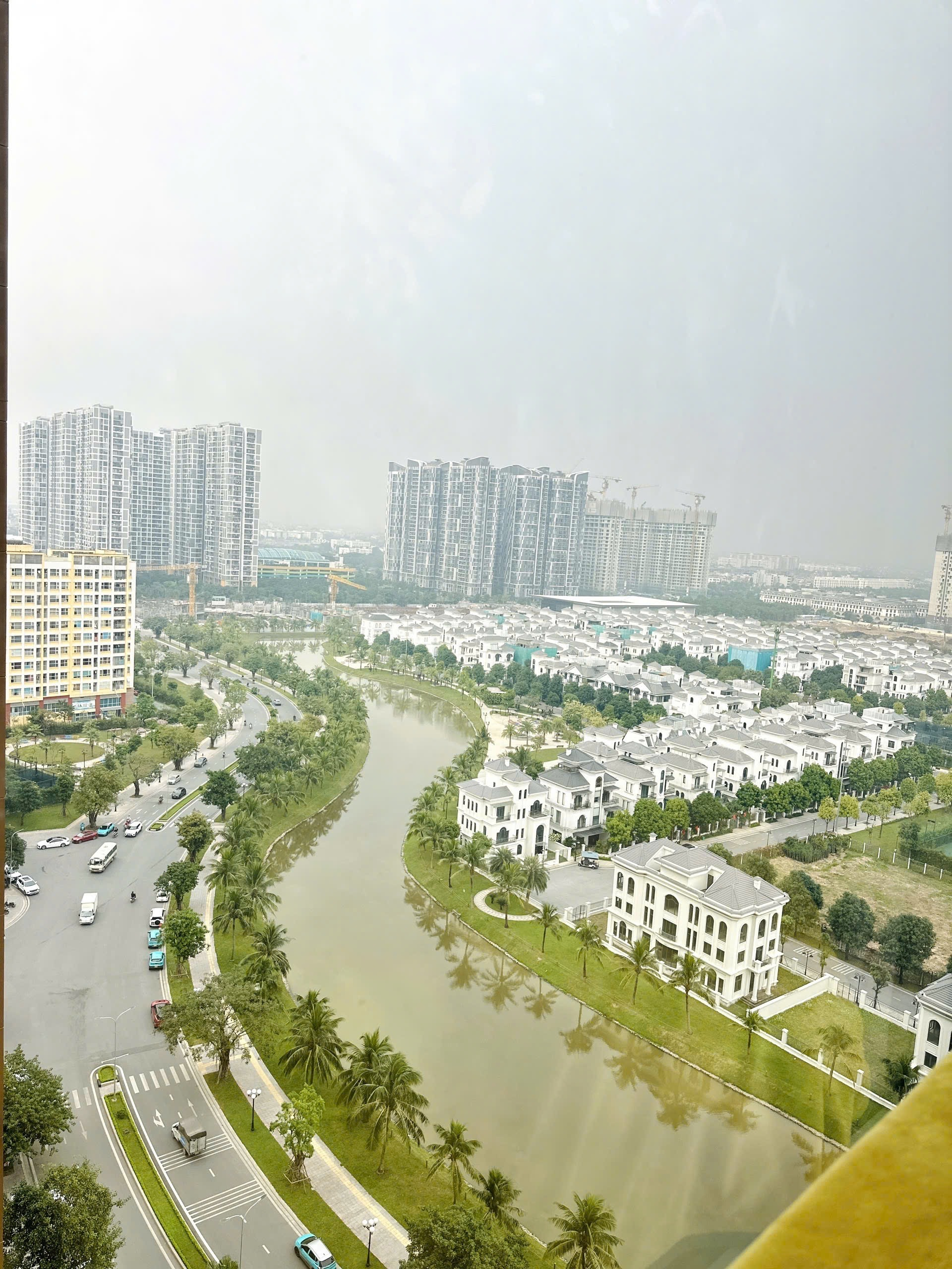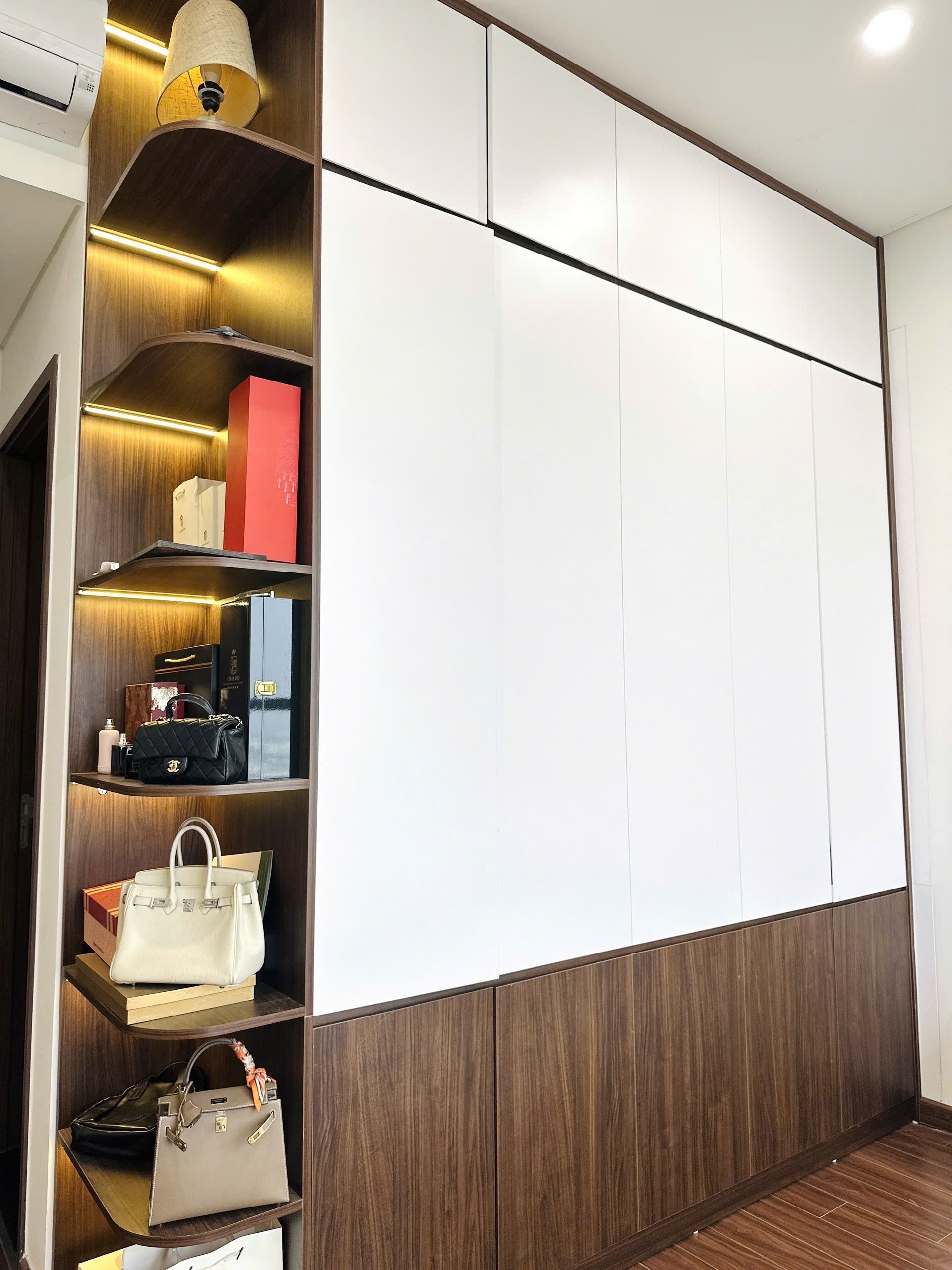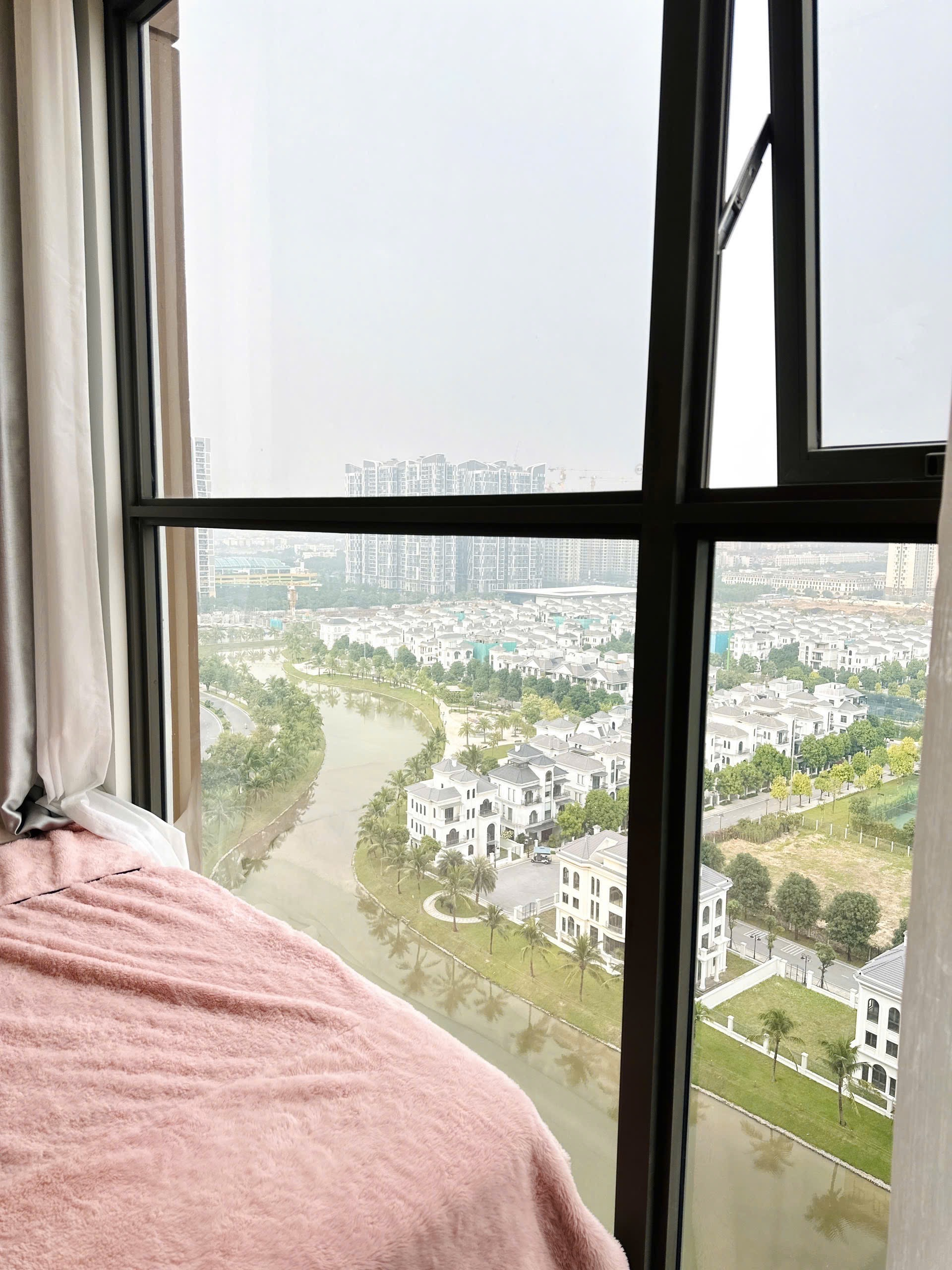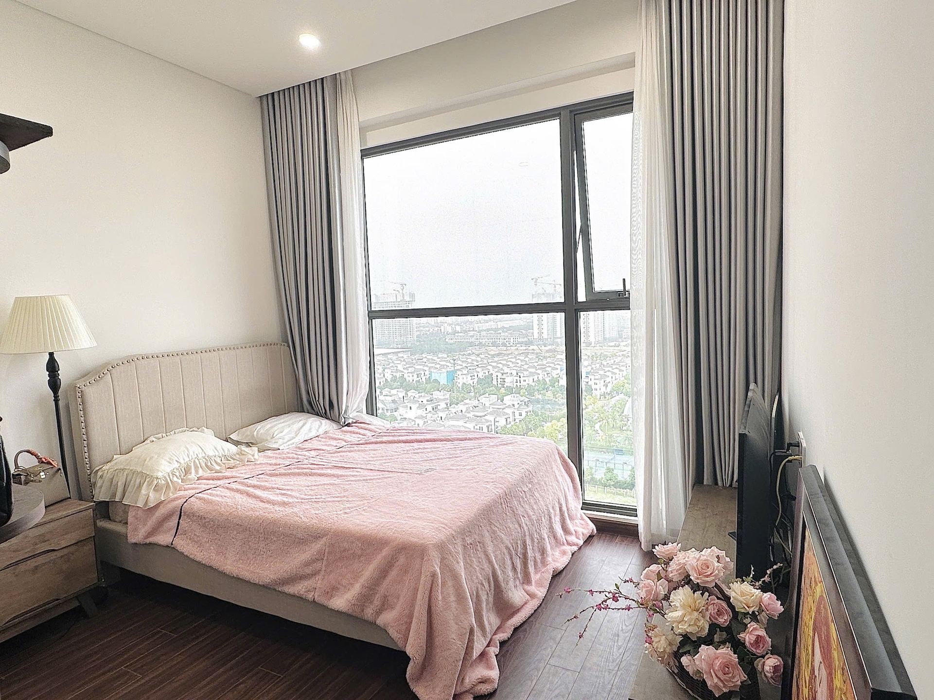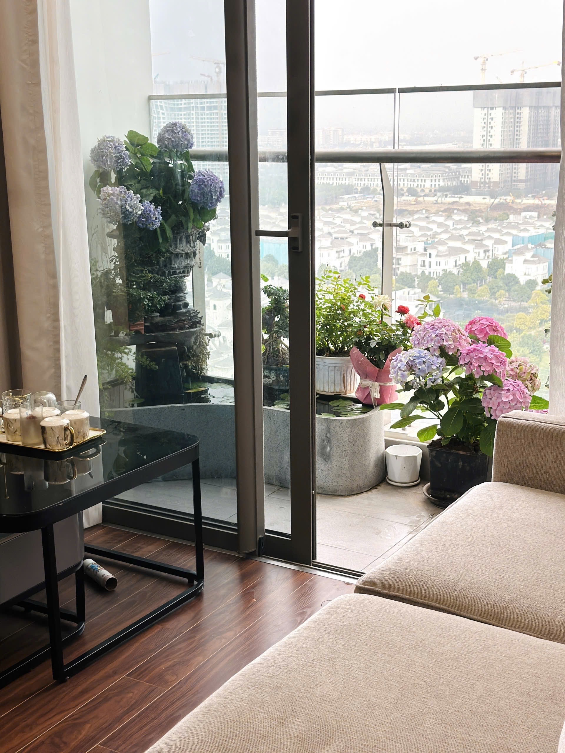 Căn hộ hiện đại, ấm cúng với sàn gỗ và tông màu trung tính. Không gian thoáng đãng nhờ cửa sổ lớn, ban công xanh mát cùng view thành phố tuyệt đẹp.