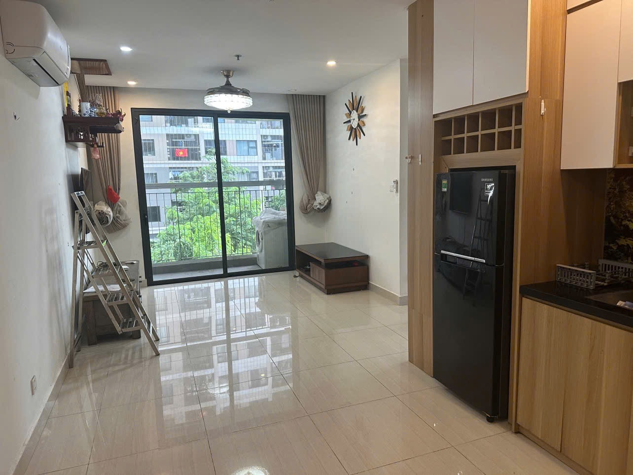 Căn hộ hiện đại, thoáng đãng với sàn gỗ và gạch men sáng bóng. Nội thất cơ bản, tông màu trung tính, ánh sáng tự nhiên chan hòa.