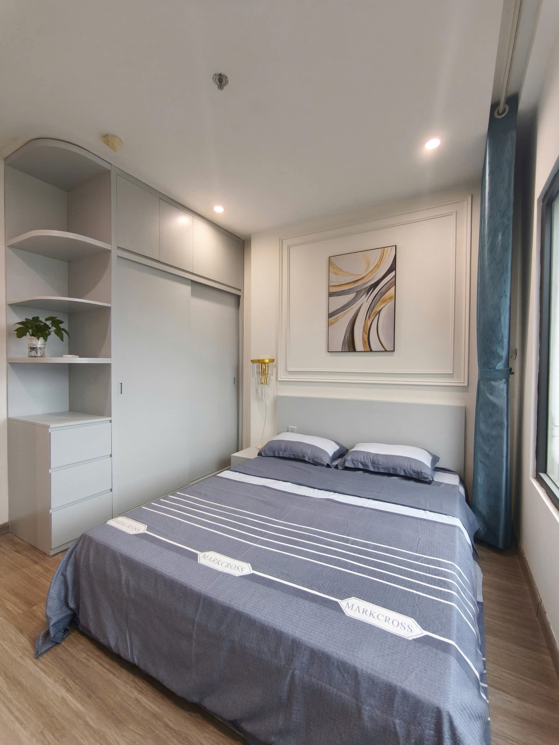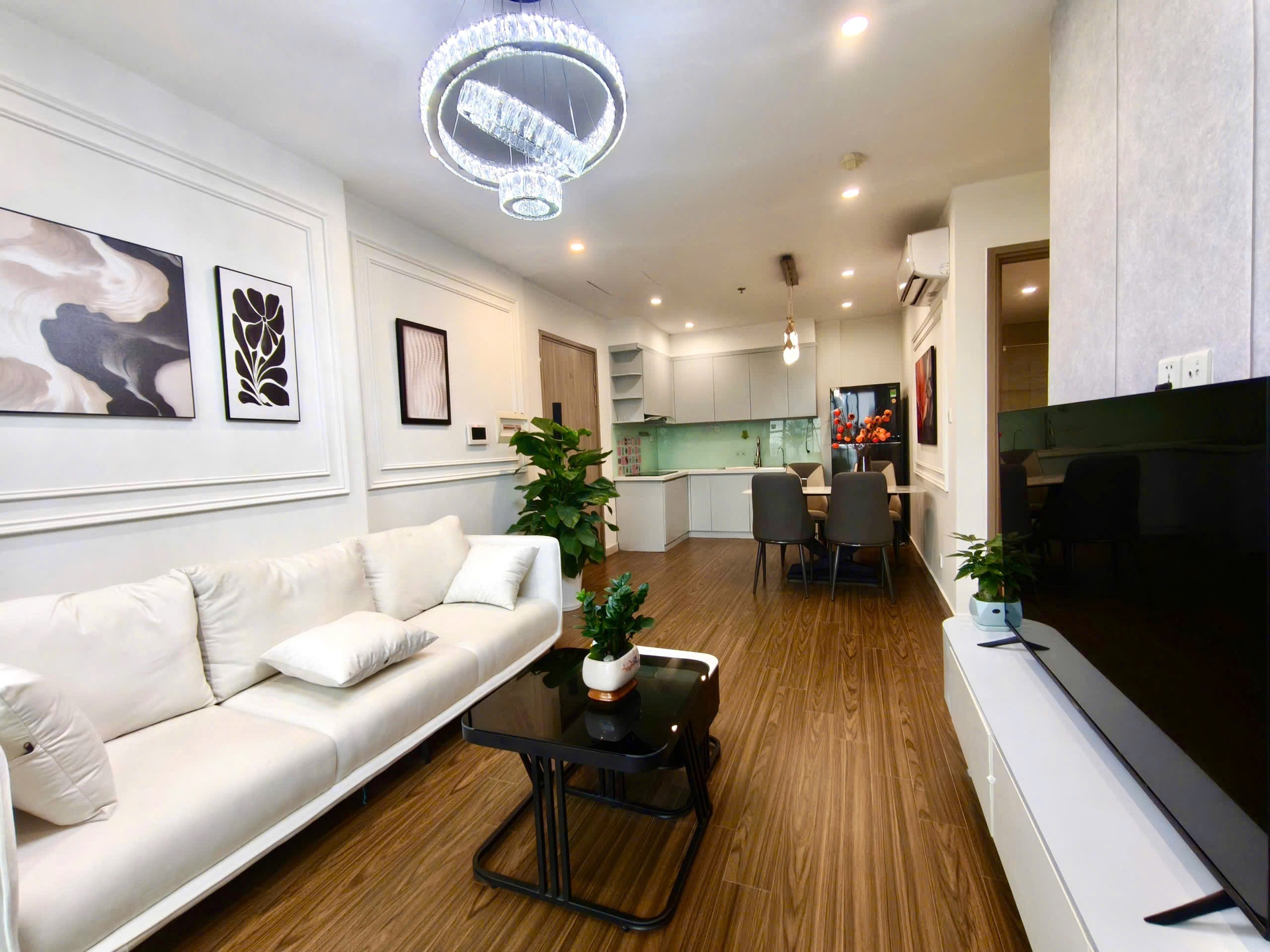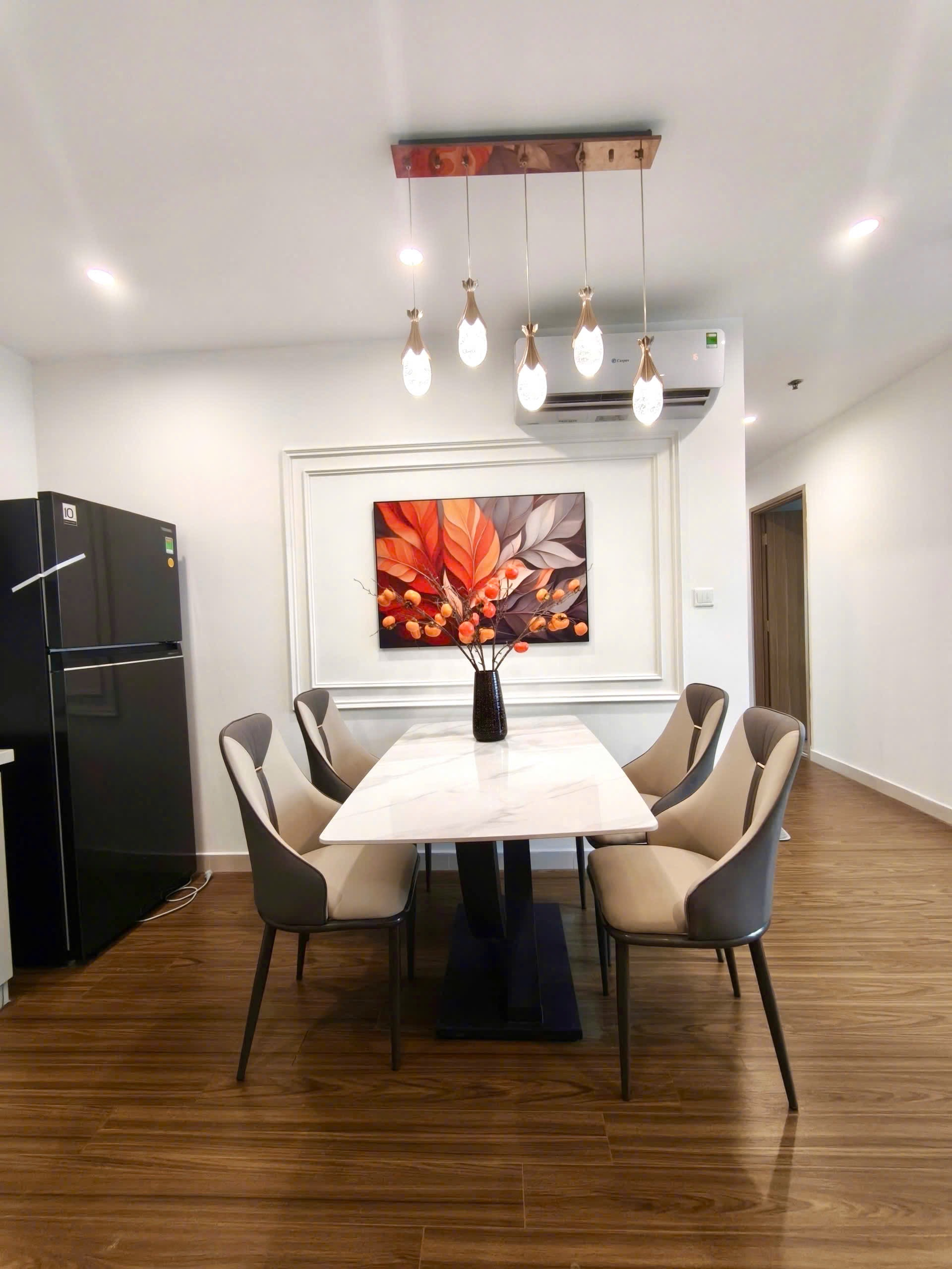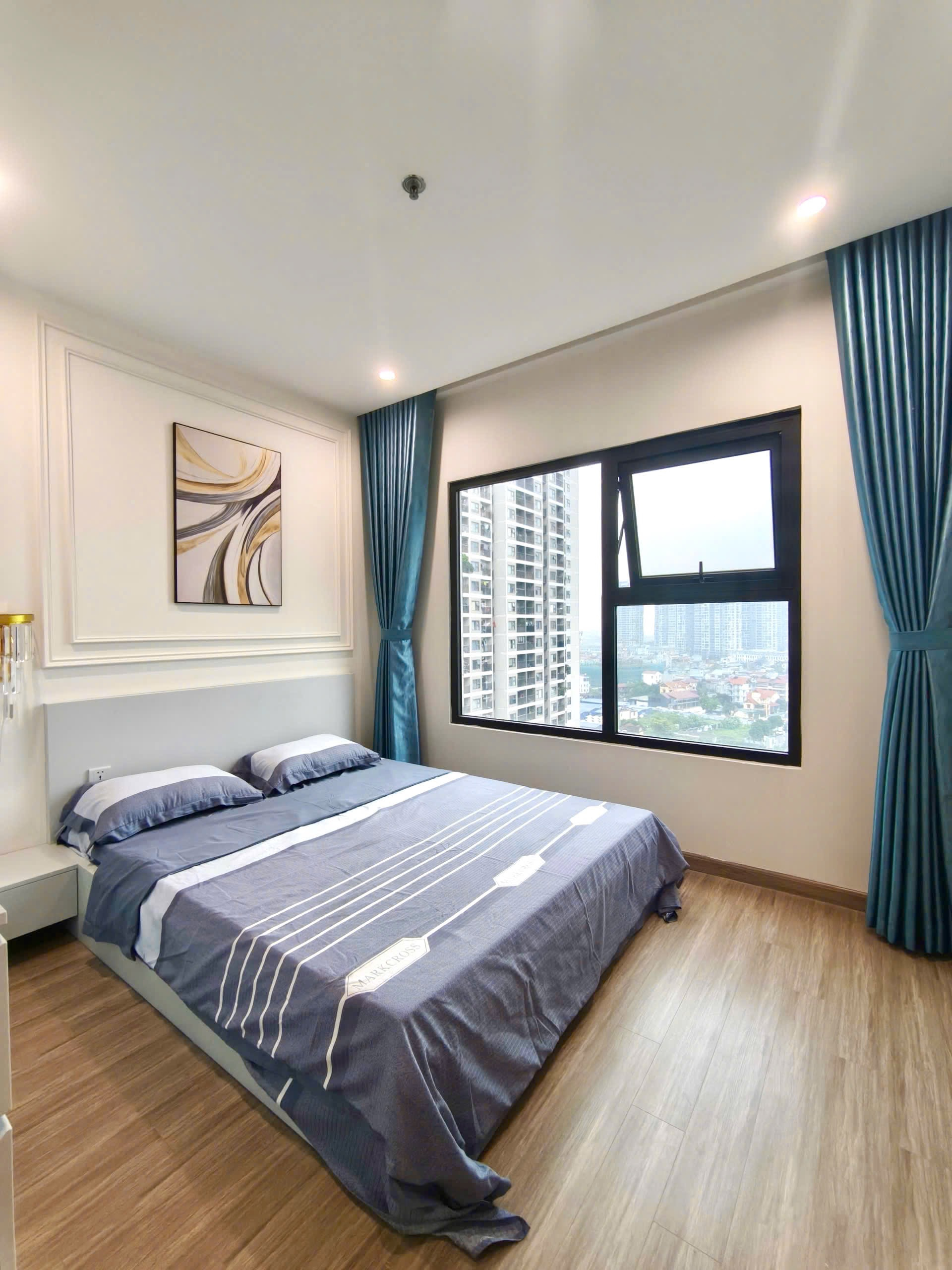 Căn hộ hiện đại, sang trọng với sàn gỗ ấm cúng, nội thất tông trắng be tinh tế. Ánh sáng tự nhiên chan hòa, đầy đủ tiện nghi và hoàn thiện cao cấp.