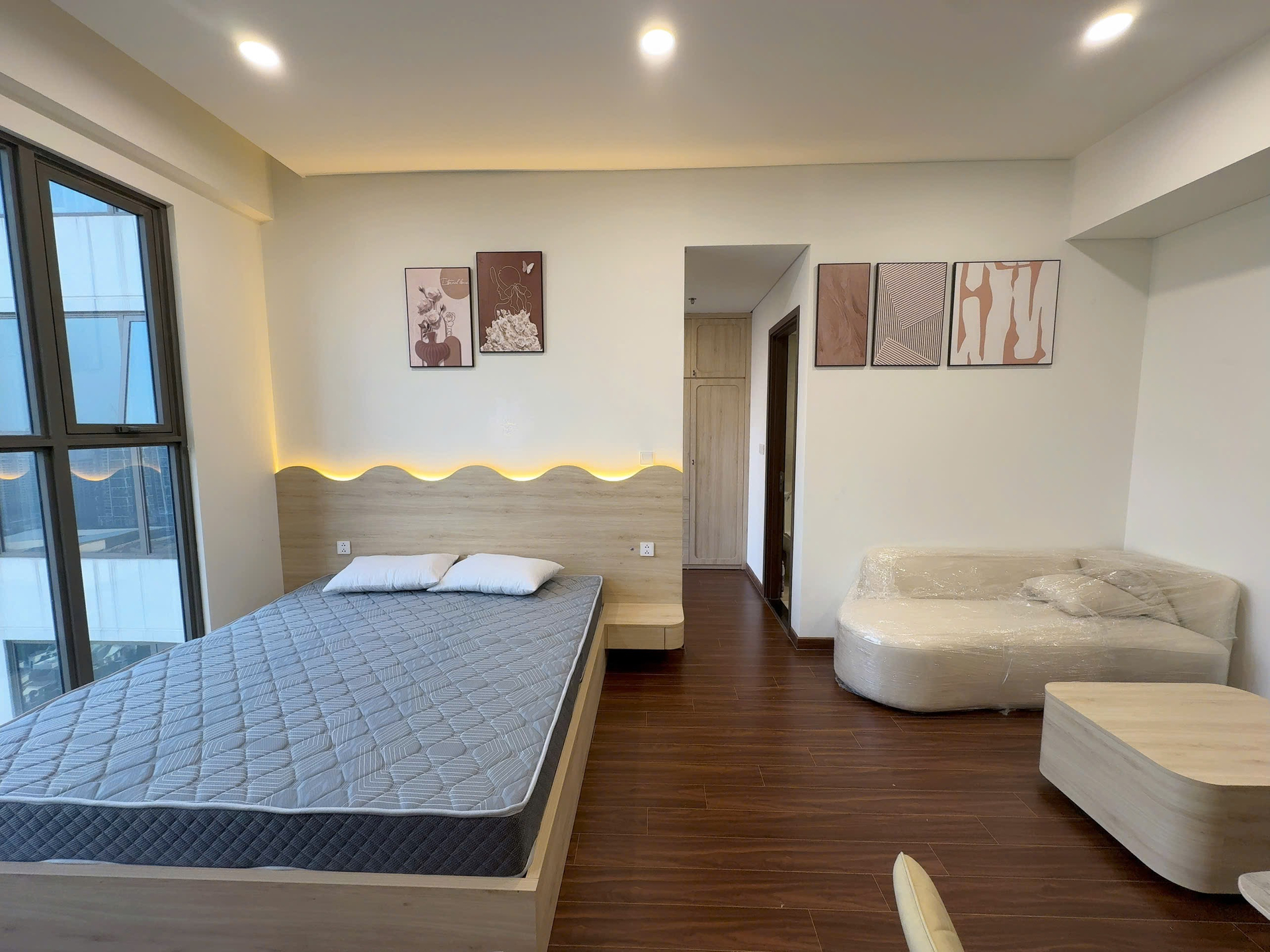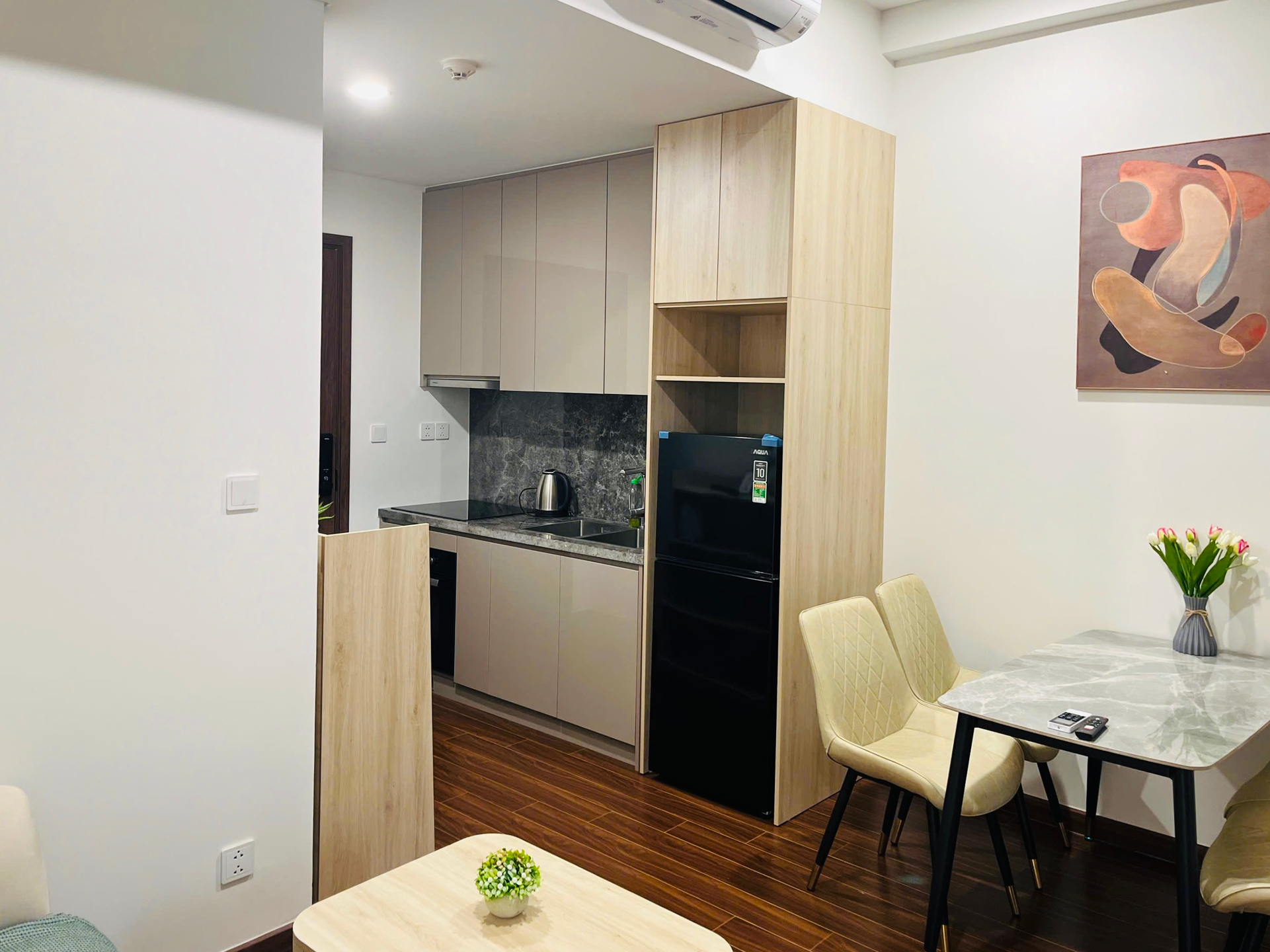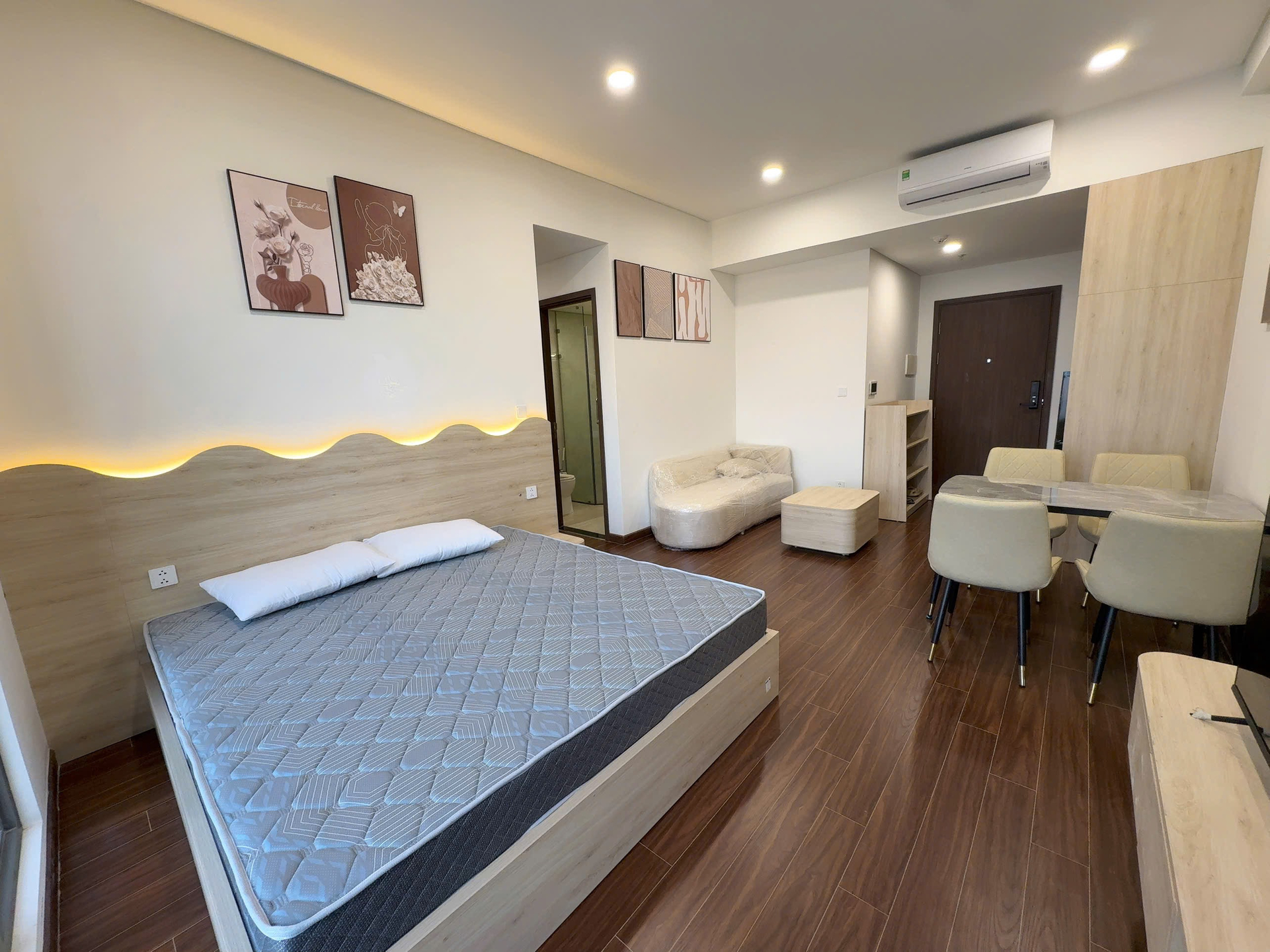 Căn hộ studio hiện đại, thiết kế thông minh với nội thất gỗ sáng màu, sàn gỗ ấm cúng và đầy đủ tiện nghi, mang lại không gian sống tiện lợi.
