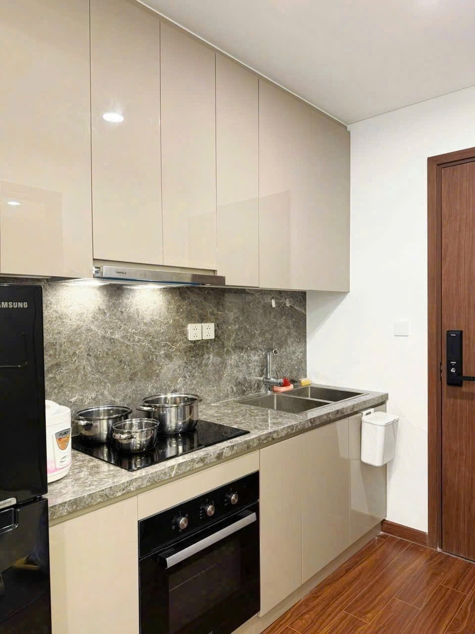 Studio hiện đại, ấm cúng với sàn gỗ, nội thất tông trắng be và bếp mở tiện nghi. Không gian được tối ưu, đầy đủ tiện ích.