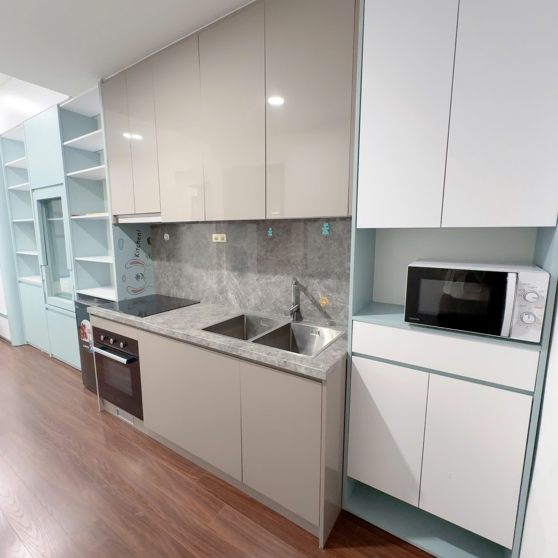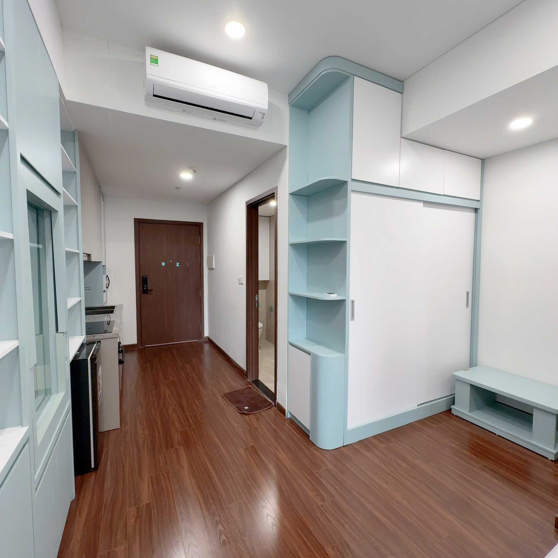 Studio hiện đại, tối ưu không gian với nội thất tông xanh pastel và trắng. Sàn gỗ ấm cúng, bếp tiện nghi và phòng tắm hoàn thiện cao cấp.