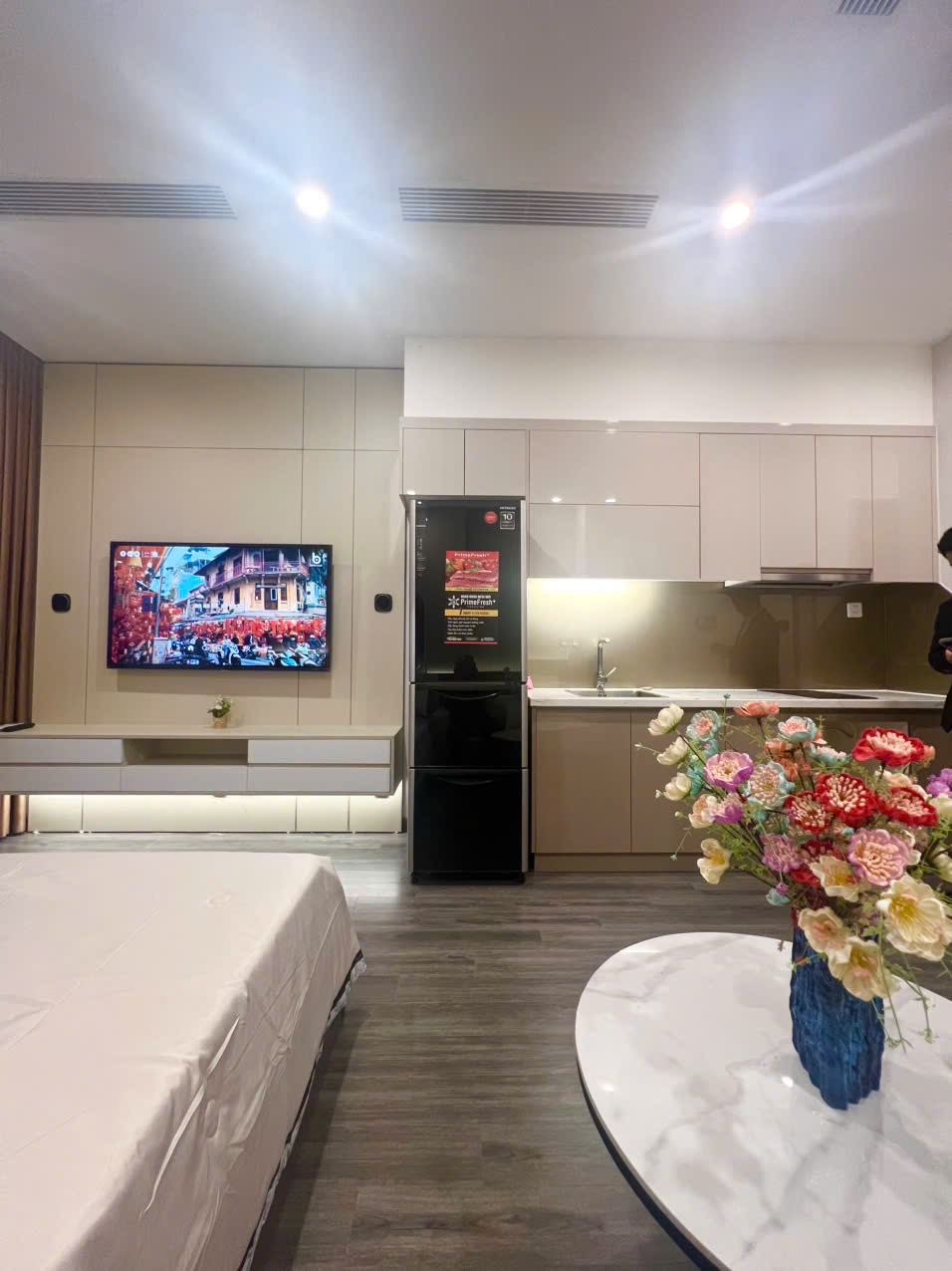 Căn hộ studio hiện đại, tông màu be ấm cúng với sàn gỗ và ánh sáng tự nhiên. Đầy đủ tiện nghi, bao gồm bếp nhỏ và phòng tắm sang trọng.
