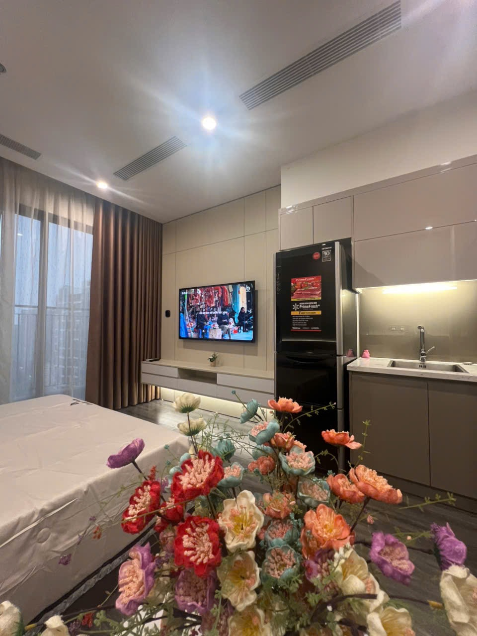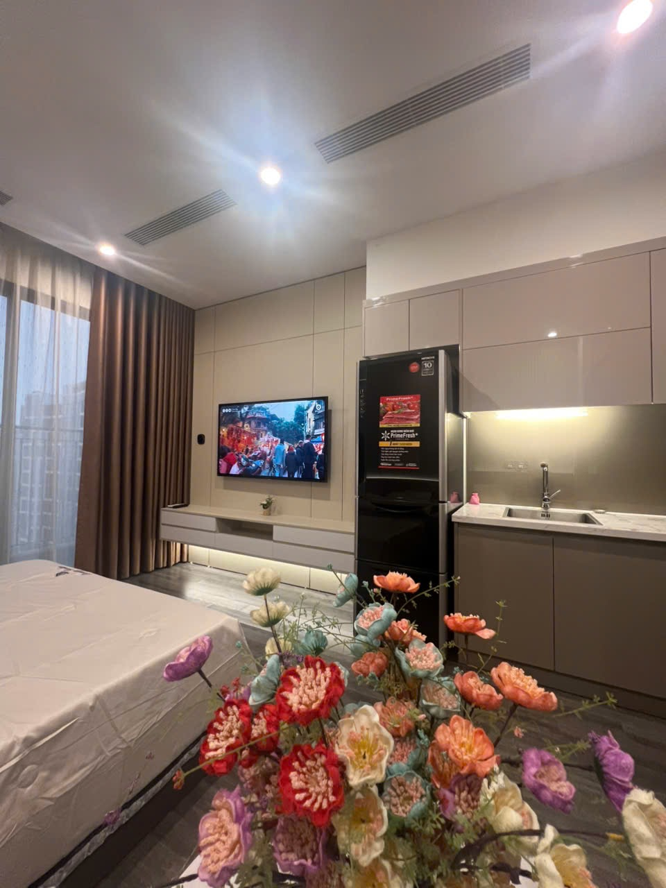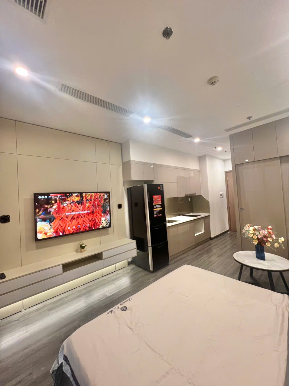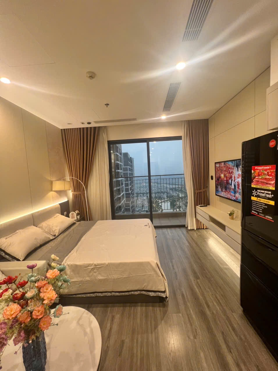 Studio hiện đại, tông màu be ấm cúng với sàn gỗ, cửa sổ lớn đón ánh sáng tự nhiên và view thành phố. Đầy đủ tiện nghi, hoàn thiện cao cấp.