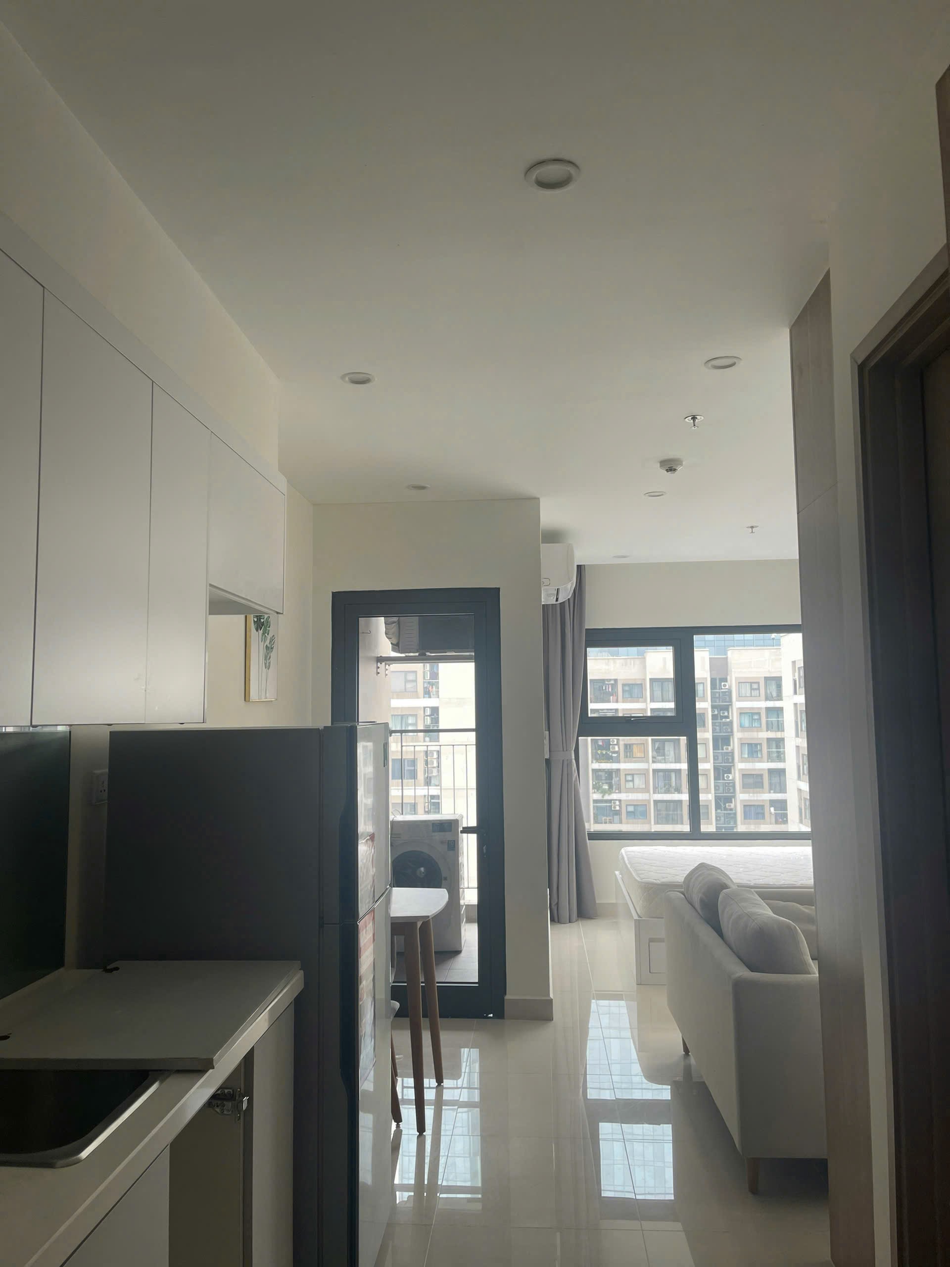 Căn hộ studio hiện đại, tối giản với tông màu trắng sáng, nội thất cơ bản và đầy đủ tiện nghi. Không gian thoáng đãng, sạch sẽ.