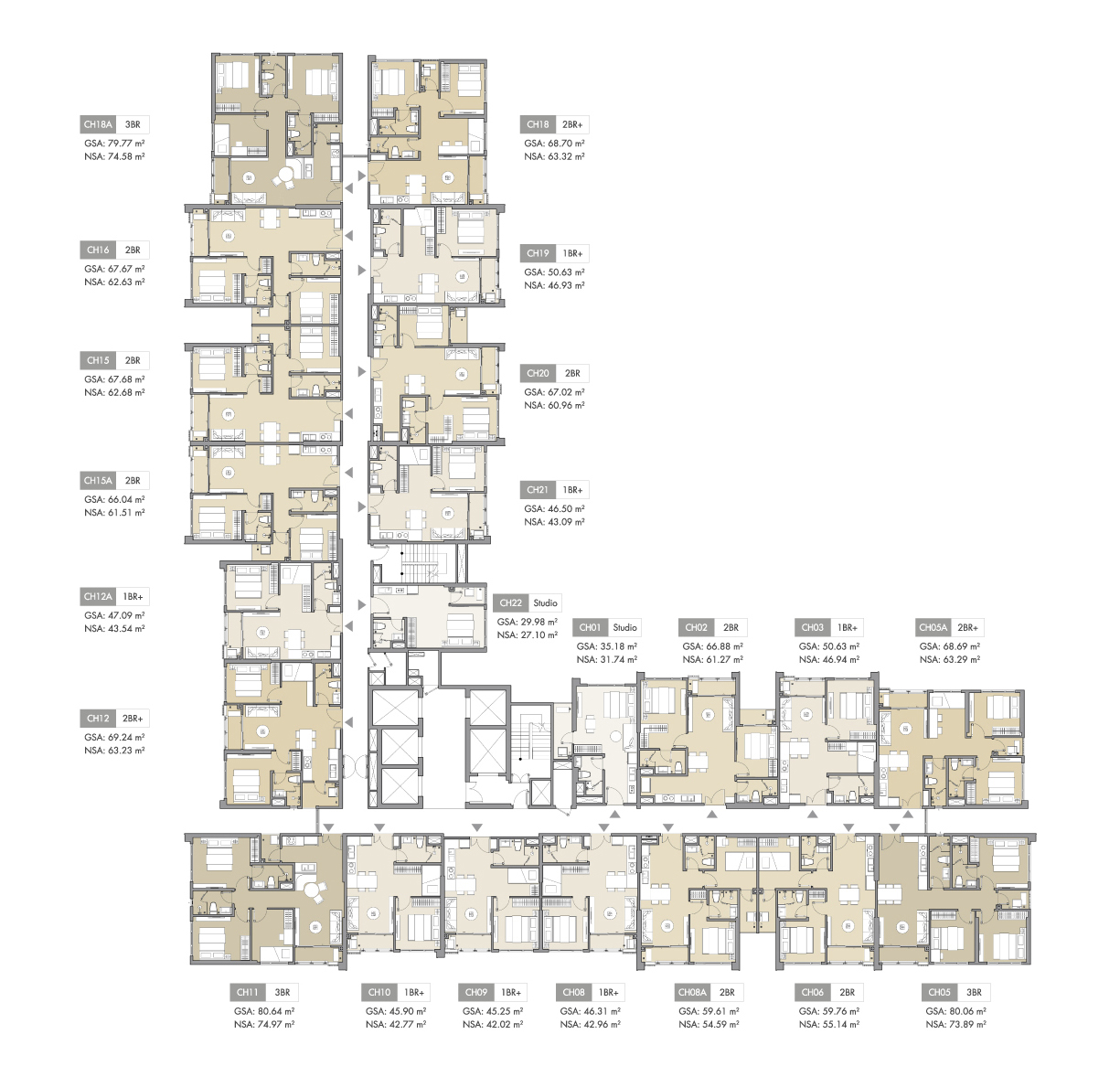 căn hộ 1 phòng ngủ có diện tích từ 41.2 - 62 m². Căn hộ 2 phòng ngủ có diện tích từ 53.66 - 65 m². Căn hộ 3 phòng ngủ có diện tích từ 73.89 - 122.86 m². Căn hộ 4 phòng ngủ có diện tích từ 129.6 - 153.34 m²